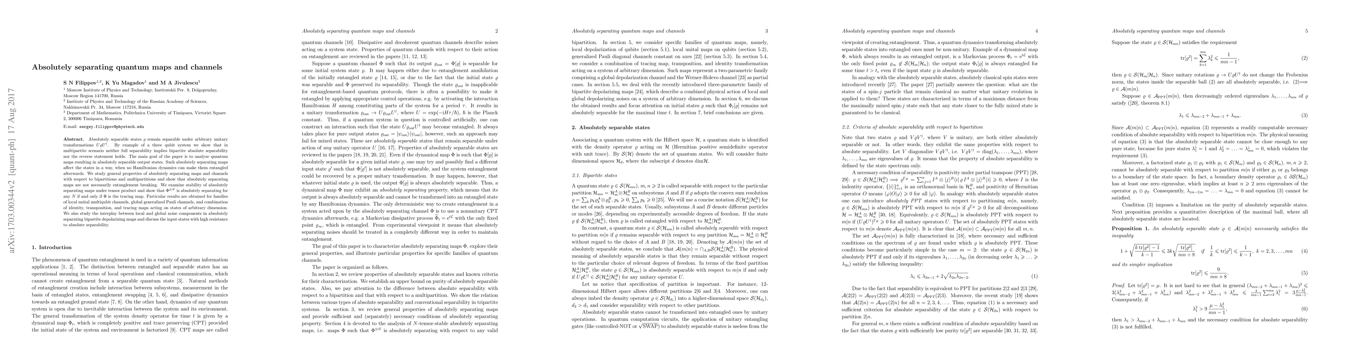 This paper explores the properties of absolutely separating quantum maps and channels, which preserve the absolute separability of states under any unitary transformation. It investigates the conditions under which such maps are entanglement breaking and examines their stability under tensor product operations, concluding that only the tracing map retains absolute separability for any number of copies.