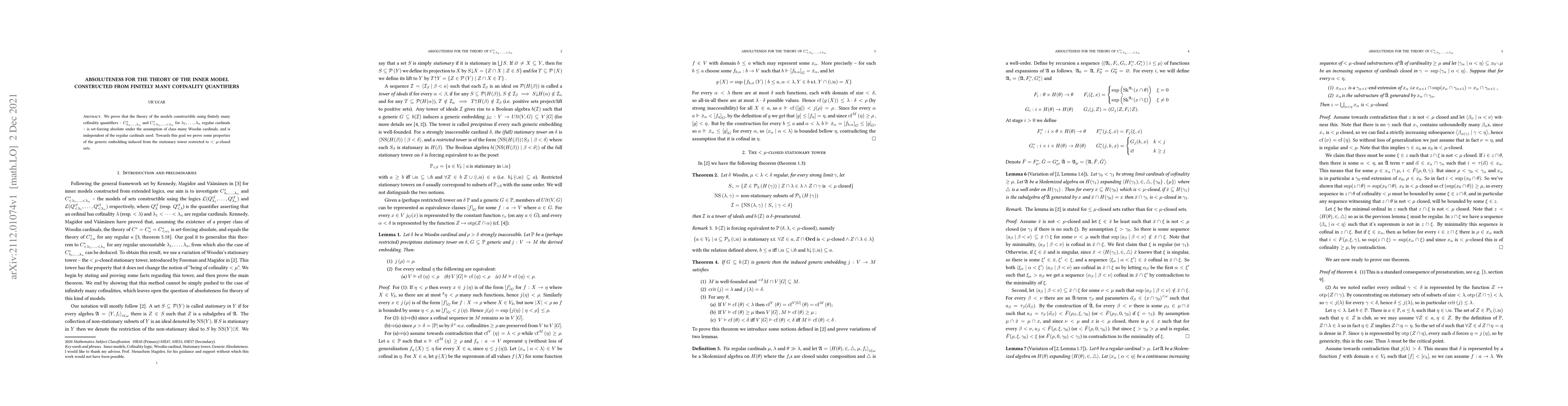 We prove that the theory of the models constructible using finitely many cofinality quantifiers - $C_{\lambda_{1},...,\lambda_{n}}^{*}$ and $C_{<\lambda_{1},...,<\lambda_{n}}^{*}$ for $\lambda_{1},...,\lambda_{n}$ regular cardinals - is set-forcing absolute under the assumption of class many Woodin cardinals, and is independent of the regular cardinals used. Towards this goal we prove some properties of the generic embedding induced from the stationary tower restricted to $<\mu$-closed sets.