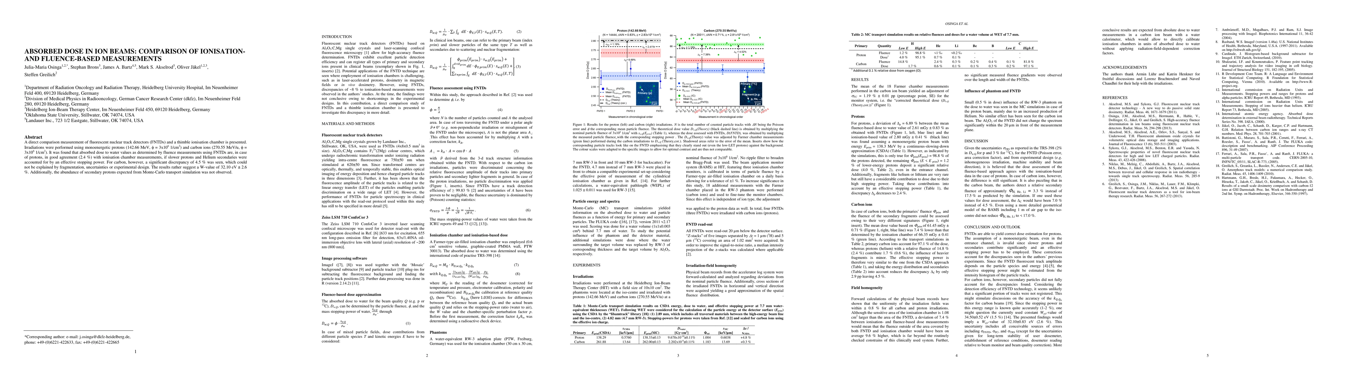 The paper presents a direct comparison of FNTDs and ionisation chambers for absorbed dose measurements in ion beams, highlighting the performance and limitations of each technique.