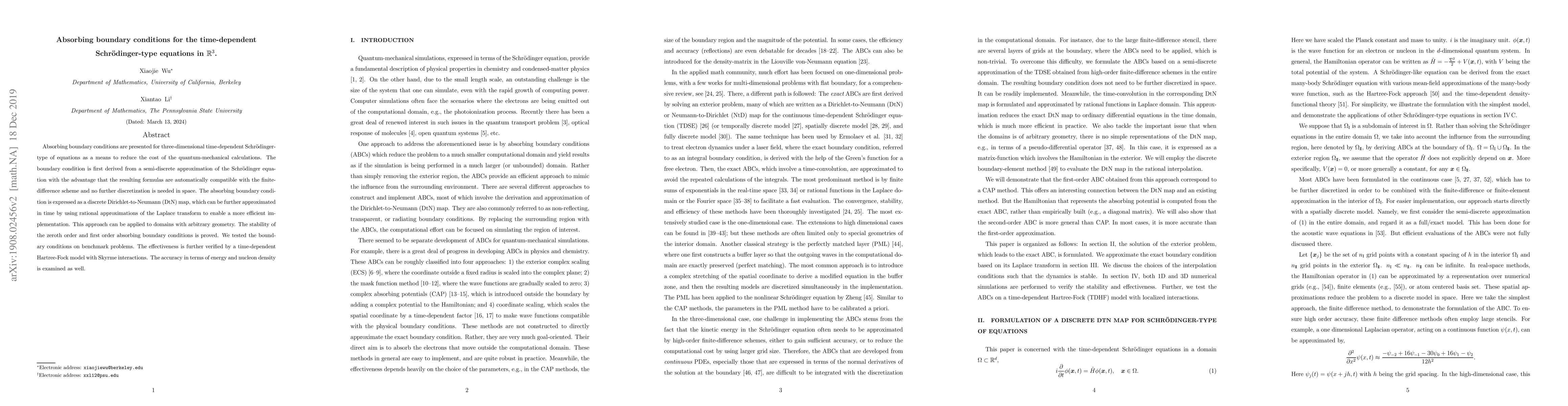 Researchers developed absorbing boundary conditions for 3D time-dependent Schr"odinger-type equations to reduce quantum-mechanical calculation costs, with stable and effective methods verified through testing and application in a Hartree-Fock model.