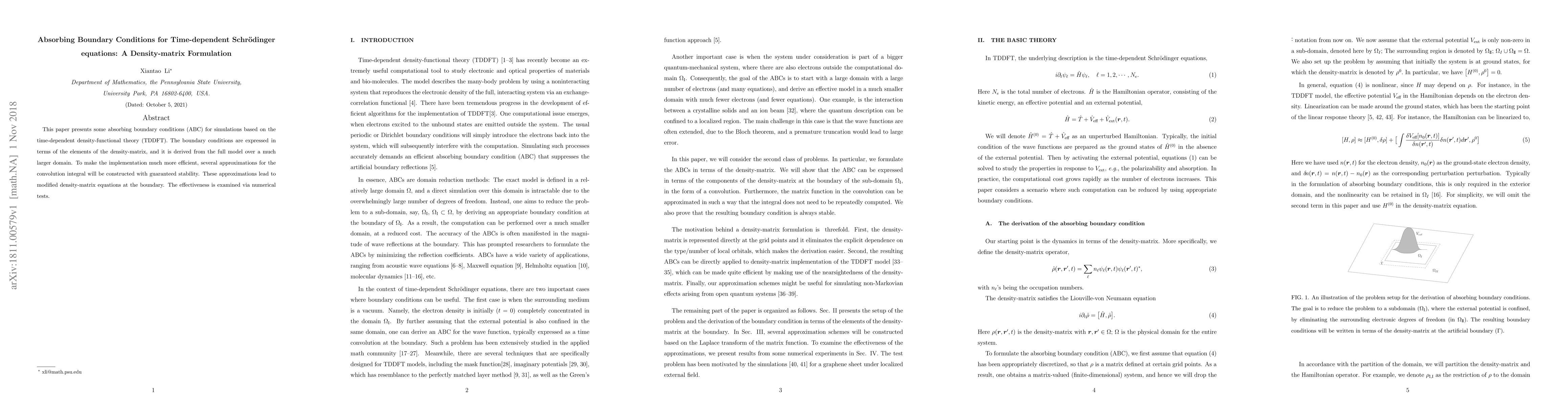 This paper introduces absorbing boundary conditions for time-dependent Schrödinger equations using a density-matrix formulation derived from TDDFT. It proposes efficient approximations for convolution integrals to ensure stability and examines their effectiveness through numerical tests.