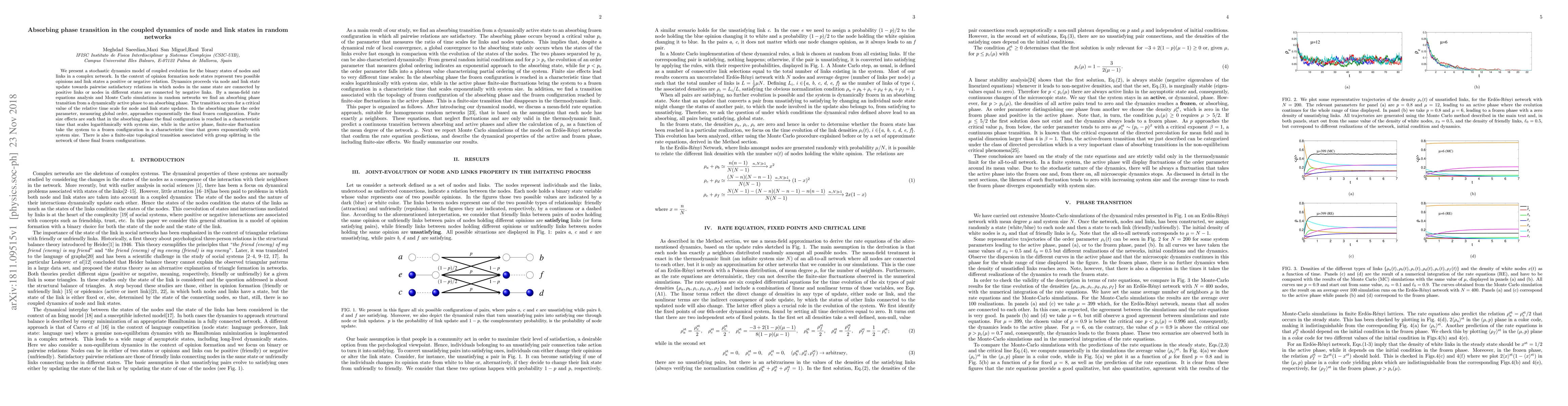 We present a stochastic dynamics model of coupled evolution for the binary states of nodes and links in a complex network. In the context of opinion formation node states represent two possible opinions and link states a positive or negative relation. Dynamics proceeds via node and link state update towards pairwise satisfactory relations in which nodes in the same state are connected by positive links or nodes in different states are connected by negative links. By a mean-field rate equations analysis and Monte Carlo simulations in random networks we find an absorbing phase transition from a dynamically active phase to an absorbing phase. The transition occurs for a critical value of the relative time scale for node and link state updates. In the absorbing phase the order parameter, measuring global order, approaches exponentially the final frozen configuration. Finite size effects are such that in the absorbing phase the final configuration is reached in a characteristic time that scales logarithmically with system size, while in the active phase, finite-size fluctuation take the system to a frozen configuration in a characteristic time that grows exponentially with system size. There is also a finite-size topological transition associated with group splitting in the network of these final frozen configurations.