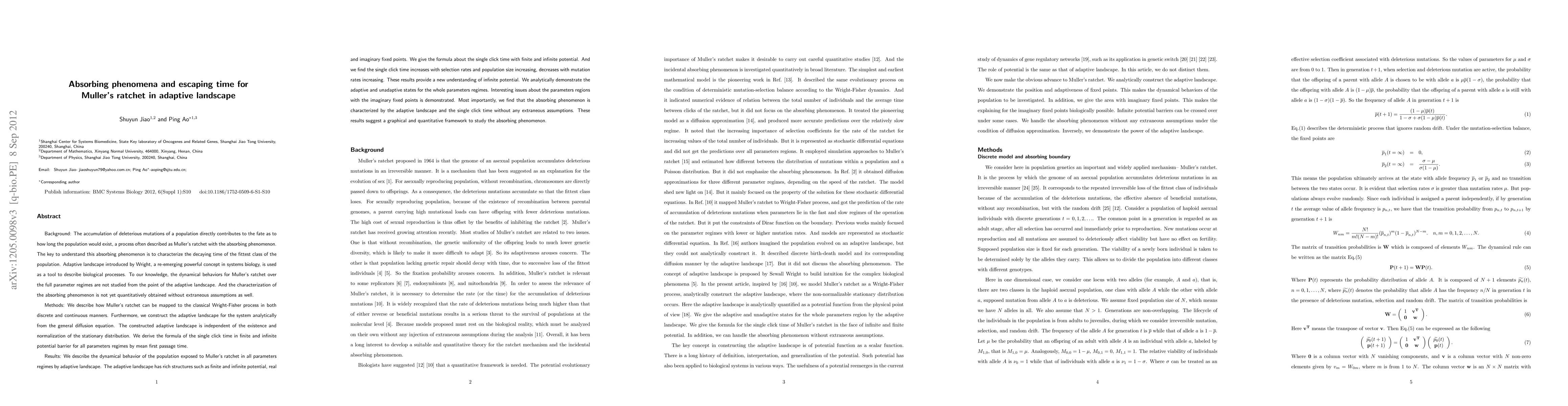 This paper investigates the dynamical behaviors of Muller's ratchet in adaptive landscapes, providing a quantitative framework for understanding the absorbing phenomenon. It reveals how the single click time varies with selection rates, population size, and mutation rates, and demonstrates the adaptive and unadaptive states across all parameter regimes, offering insights into the biological significance of critical points.