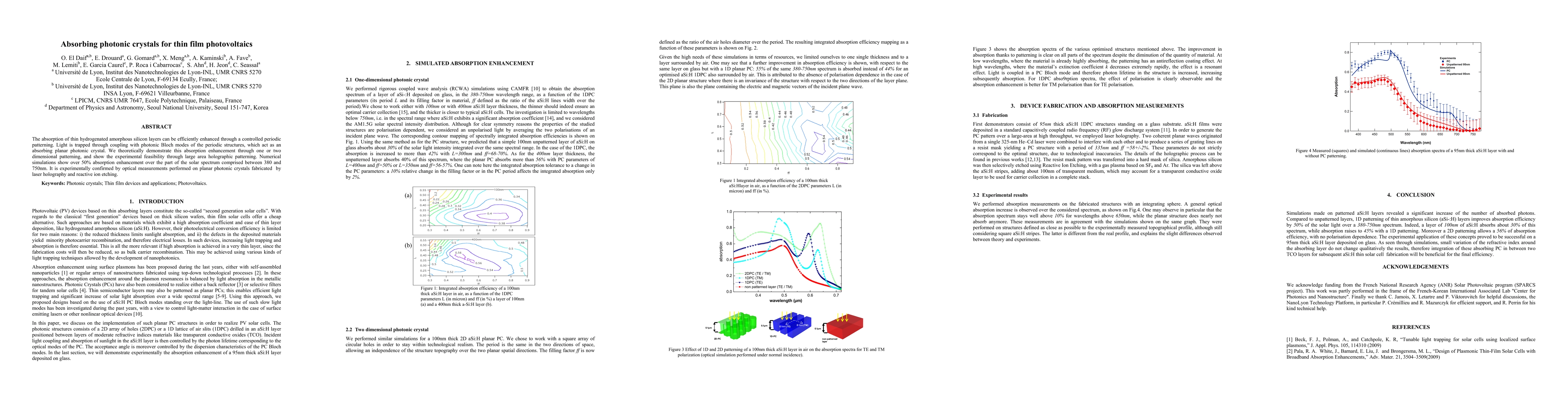 This paper demonstrates a method to enhance absorption in thin hydrogenated amorphous silicon layers using periodic patterning to create photonic crystals. Numerical simulations and experiments show over 50% absorption enhancement in the solar spectrum range, confirmed by optical measurements on fabricated planar photonic crystals.