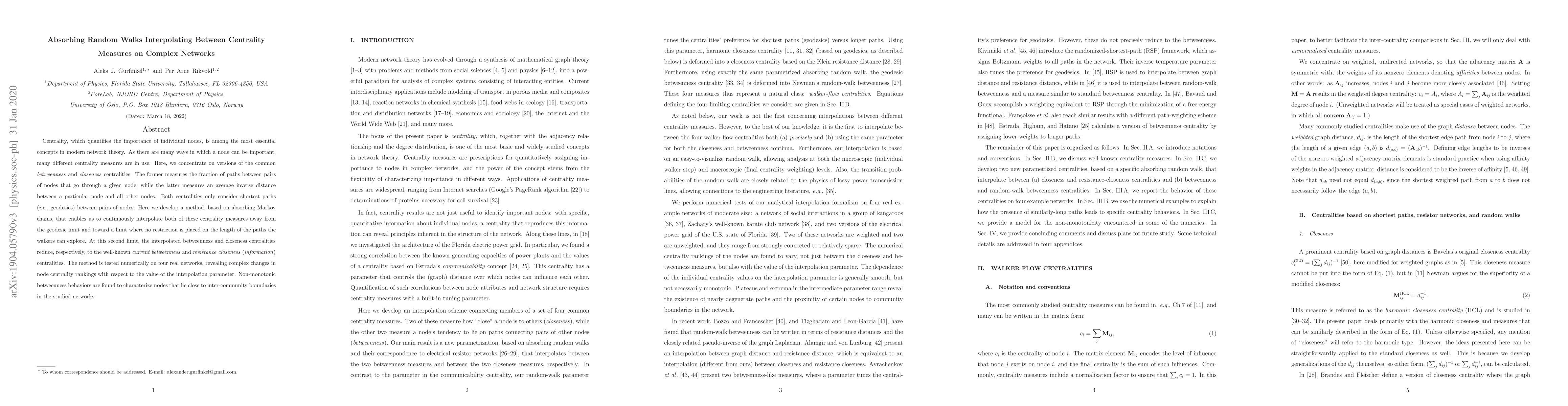 Centrality, which quantifies the "importance" of individual nodes, is among the most essential concepts in modern network theory. As there are many ways in which a node can be important, many different centrality measures are in use. Here, we concentrate on versions of the common betweenness and it closeness centralities. The former measures the fraction of paths between pairs of nodes that go through a given node, while the latter measures an average inverse distance between a particular node and all other nodes. Both centralities only consider shortest paths (i.e., geodesics) between pairs of nodes. Here we develop a method, based on absorbing Markov chains, that enables us to continuously interpolate both of these centrality measures away from the geodesic limit and toward a limit where no restriction is placed on the length of the paths the walkers can explore. At this second limit, the interpolated betweenness and closeness centralities reduce, respectively, to the well-known it current betweenness and resistance closeness (information) centralities. The method is tested numerically on four real networks, revealing complex changes in node centrality rankings with respect to the value of the interpolation parameter. Non-monotonic betweenness behaviors are found to characterize nodes that lie close to inter-community boundaries in the studied networks.