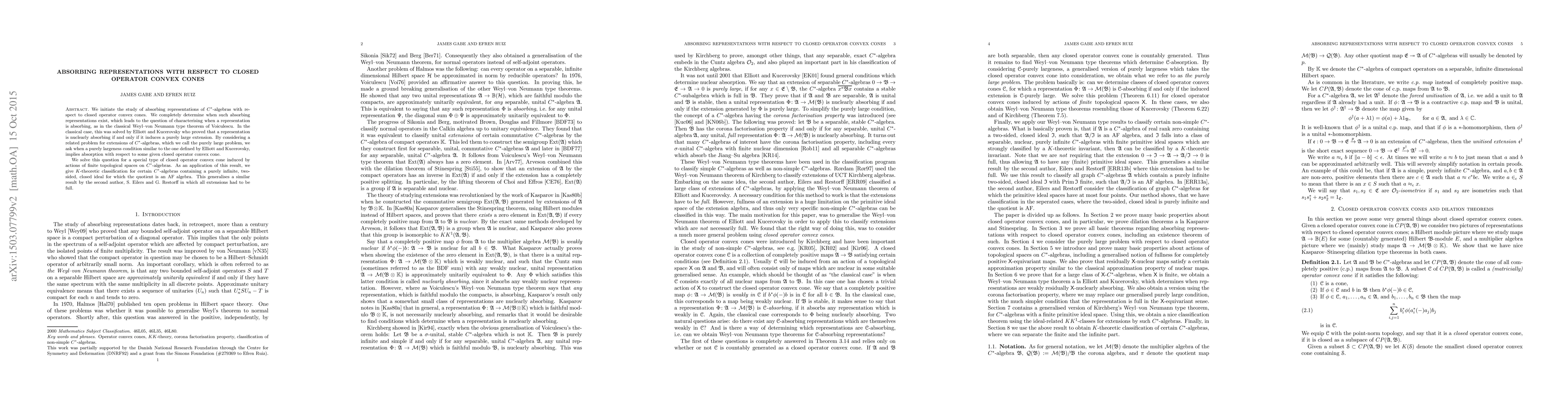 We initiate the study of absorbing representations of $C^\ast$-algebras with respect to closed operator convex cones. We completely determine when such absorbing representations exist, which leads to the question of characterising when a representation is absorbing, as in the classical Weyl-von Neumann type theorem of Voiculescu. In the classical case, this was proven by Elliott and Kucerovsky who proved that a representation is nuclearly absorbing if and only if it induces a purely large extension. By considering a related problem for extensions of $C^\ast$-algebras, which we call the purely large problem, we ask when a purely largeness condition similar to the one defined by Elliott and Kucerovsky, implies absorption with respect to some given closed operator convex cone. We solve this question for a special type of closed operator convex cone induced by actions of finite topological spaces on $C^\ast$-algebras. As an application of this result, we give $K$-theoretic classification for certain $C^\ast$-algebras containing a purely infinite, two-sided, closed ideal for which the quotient is an AF algebra. This generalises a similar result by the second author, S. Eilers and G. Restorff in which all extensions had to be full.