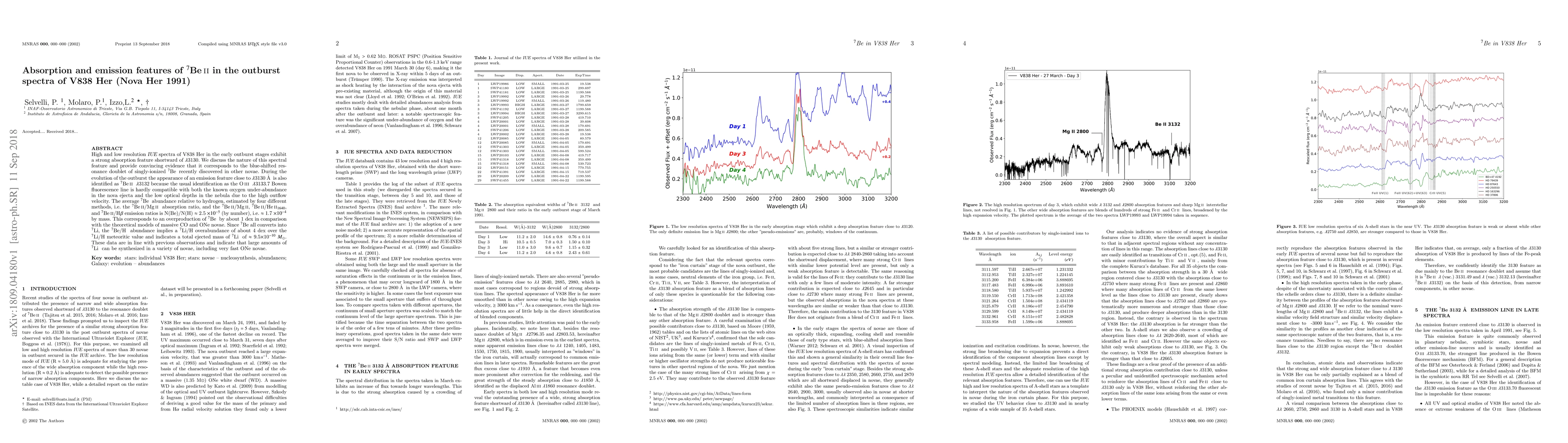 The paper identifies $^7$Be II absorption and emission features in V838 Her nova spectra, suggesting high $^7$Be abundance (N(Be)/N(H) $approx$ 2.5 $ imes$ 10$^{-5}$). This overproduction implies a $^7$Li/H overabundance of about 4 dex, indicating significant $^7$Li synthesis in novae, including fast ONe novae.