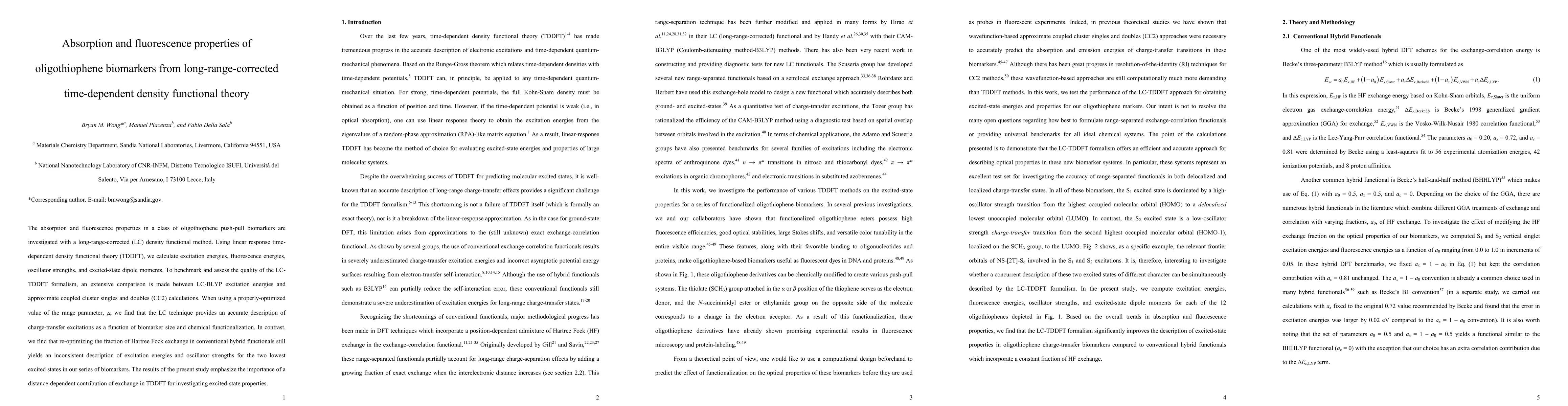 This paper investigates the absorption and fluorescence properties of oligothiophene biomarkers using long-range-corrected time-dependent density functional theory (LC-TDDFT). The study finds that LC-TDDFT, with a properly-optimized range parameter, provides an accurate description of charge-transfer excitations, while conventional hybrid functionals remain inconsistent.
