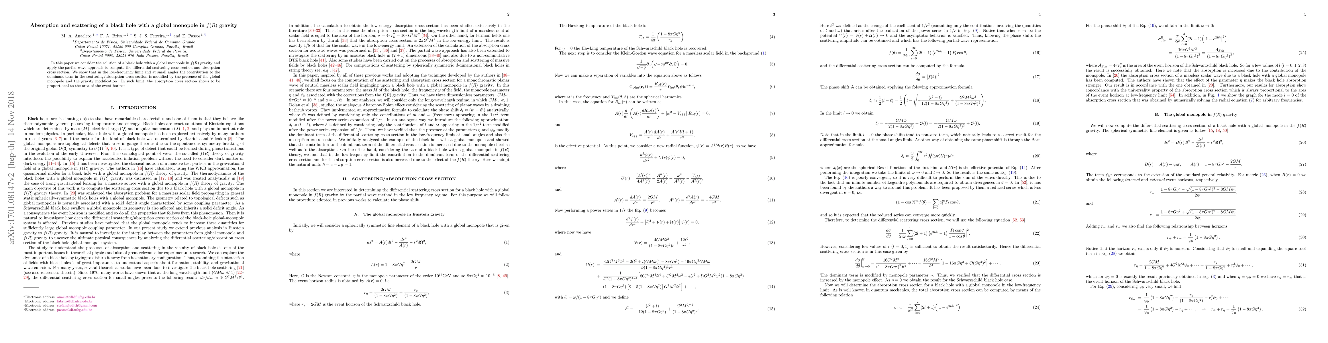 This paper investigates a black hole with a global monopole in $f(R)$ gravity, using the partial wave approach to calculate scattering and absorption cross sections. It finds that the presence of the monopole and gravity modifications alter the dominant term in these cross sections, particularly in the low-frequency limit, where the absorption cross section is proportional to the event horizon's area.