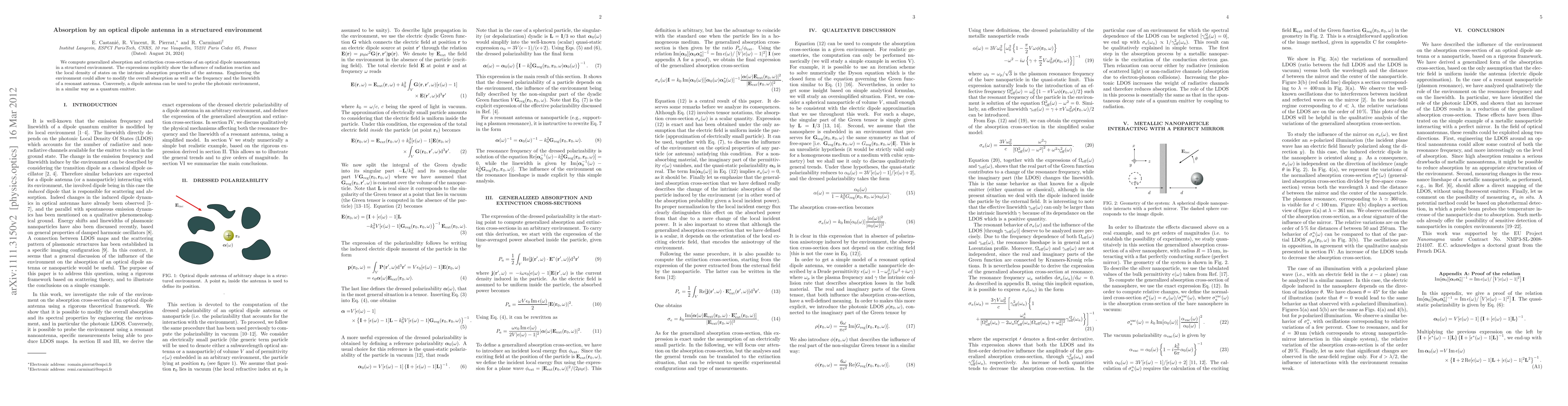 This paper computes the generalized absorption and extinction cross-sections of an optical dipole nanoantenna in a structured environment, highlighting the effects of radiation reaction and local density of states. Engineering the environment can modify the antenna's absorption, frequency, and linewidth, while the antenna can also probe the photonic environment.
