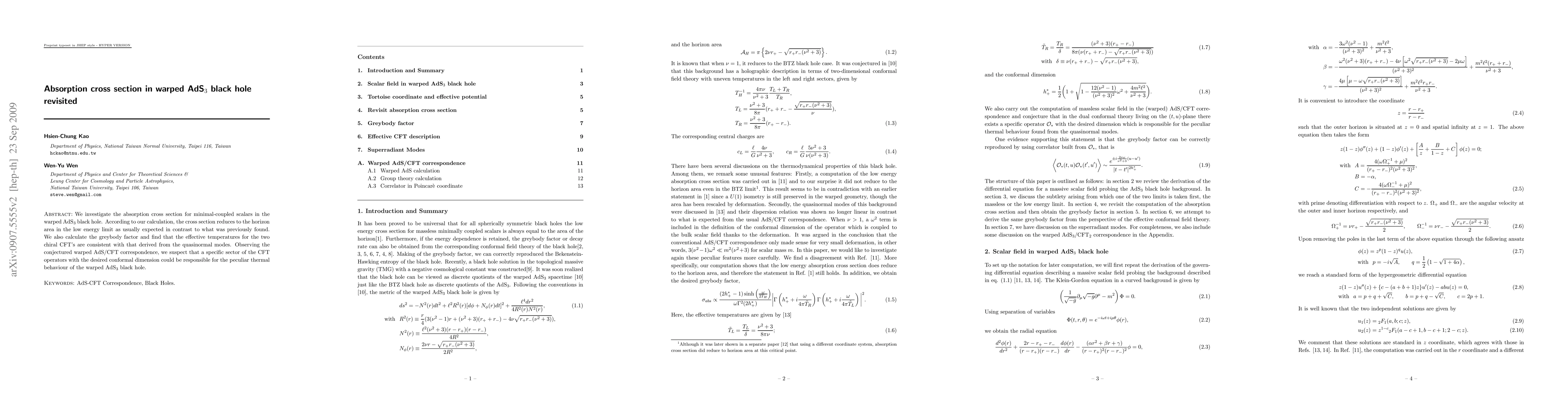 We investigate the absorption cross section for minimal-coupled scalars in the warped AdS_3 black hole. According to our calculation, the cross section reduces to the horizon area in the low energy limit as usually expected in contrast to what was previously found. We also calculate the greybody factor and find that the effective temperatures for the two chiral CFT's are consistent with that derived from the quasinormal modes. Observing the conjectured warped AdS/CFT correspondence, we suspect that a specific sector of the CFT operators with the desired conformal dimension could be responsible for the peculiar thermal behaviour of the warped AdS_3 black hole.