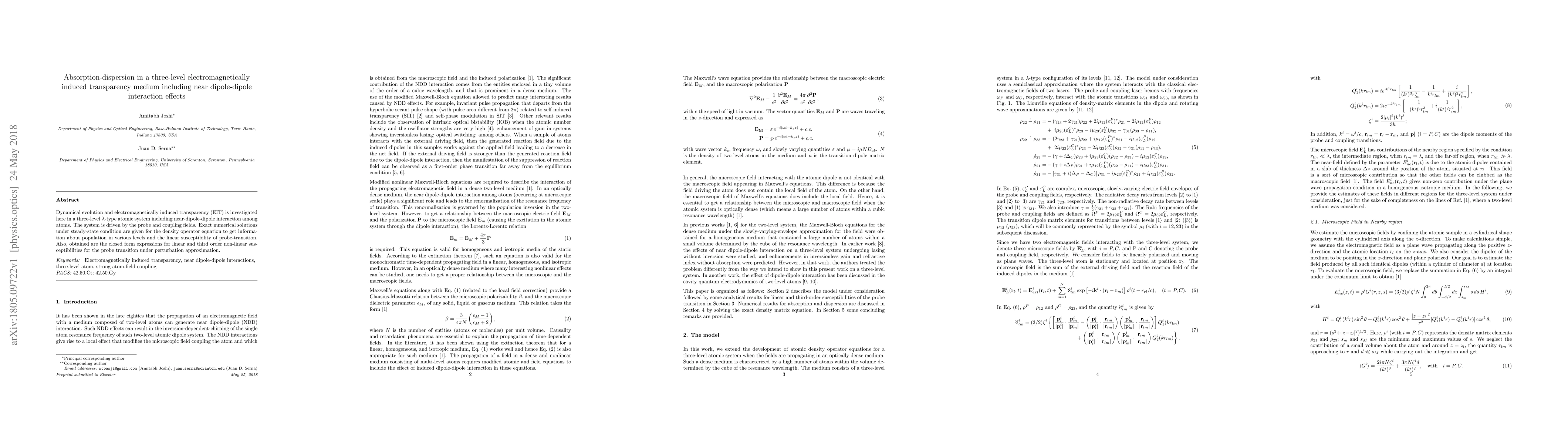 This paper investigates the dynamical evolution and electromagnetically induced transparency (EIT) in a three-level $\lambda$-type atomic system, accounting for near-dipole-dipole interactions. Exact steady-state solutions for the density operator and closed-form expressions for linear and third-order non-linear susceptibilities are derived to analyze population distribution and probe-transition susceptibility.