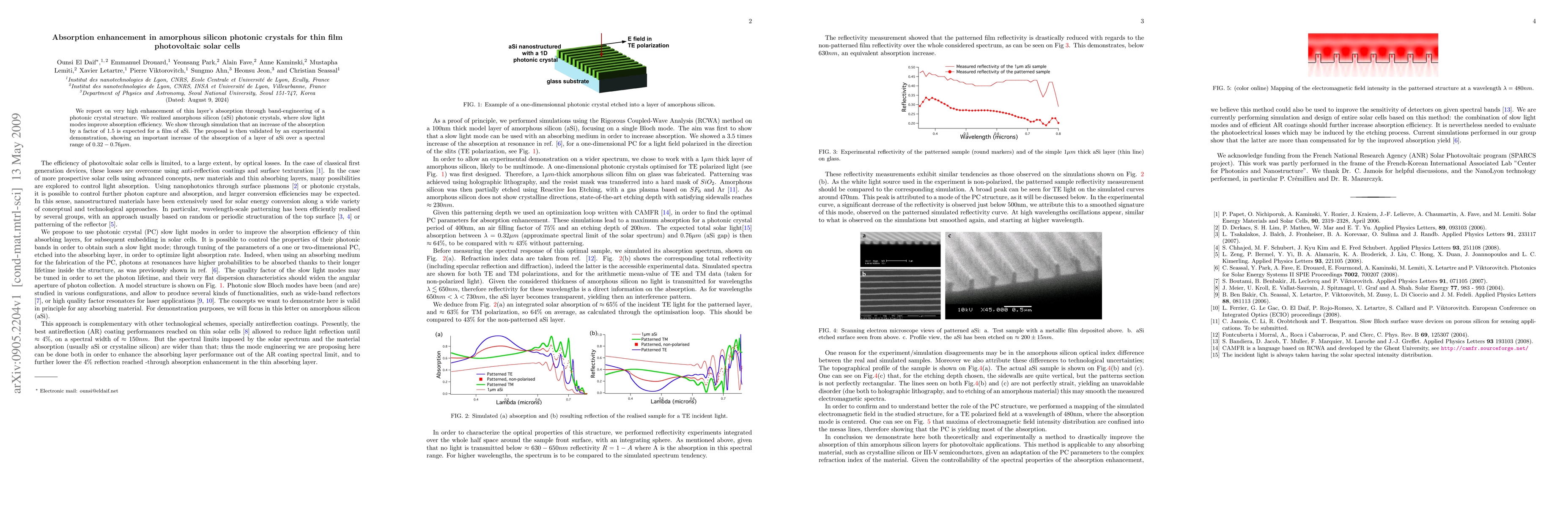 We report on very high enhancement of thin layer's absorption through band-engineering of a photonic crystal structure. We realized amorphous silicon (aSi) photonic crystals, where slow light modes improve absorption efficiency. We show through simulation that an increase of the absorption by a factor of 1.5 is expected for a film of aSi. The proposal is then validated by an experimental demonstration, showing an important increase of the absorption of a layer of aSi over a spectral range of 0.32-0.76 microns.