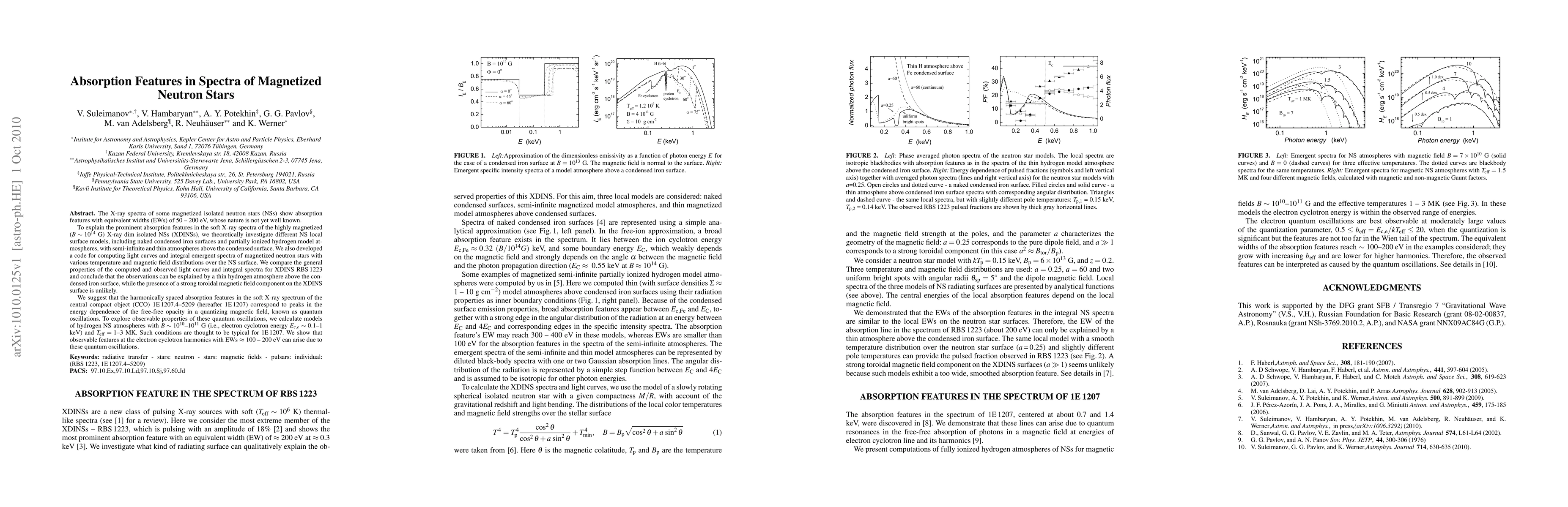 The X-ray spectra of some magnetized isolated neutron stars (NSs) show absorption features with equivalent widths (EWs) of 50 - 200 eV, whose nature is not yet well known. To explain the prominent absorption features in the soft X-ray spectra of the highly magnetized (B ~ 10^{14} G) X-ray dim isolated NSs (XDINSs), we theoretically investigate different NS local surface models, including naked condensed iron surfaces and partially ionized hydrogen model atmospheres, with semi-infinite and thin atmospheres above the condensed surface. We also developed a code for computing light curves and integral emergent spectra of magnetized neutron stars with various temperature and magnetic field distributions over the NS surface. We compare the general properties of the computed and observed light curves and integral spectra for XDINS RBS\,1223 and conclude that the observations can be explained by a thin hydrogen atmosphere above the condensed iron surface, while the presence of a strong toroidal magnetic field component on the XDINS surface is unlikely. We suggest that the harmonically spaced absorption features in the soft X-ray spectrum of the central compact object (CCO) 1E 1207.4-5209 (hereafter 1E 1207) correspond to peaks in the energy dependence of the free-free opacity in a quantizing magnetic field, known as quantum oscillations. To explore observable properties of these quantum oscillations, we calculate models of hydrogen NS atmospheres with B ~ 10^{10} - 10^{11} G (i.e., electron cyclotron energy E_{c,e} ~ 0.1 - 1 keV) and T_eff = 1 - 3 MK. Such conditions are thought to be typical for 1E 1207. We show that observable features at the electron cyclotron harmonics with EWs \approx 100 - 200 eV can arise due to these quantum oscillations.