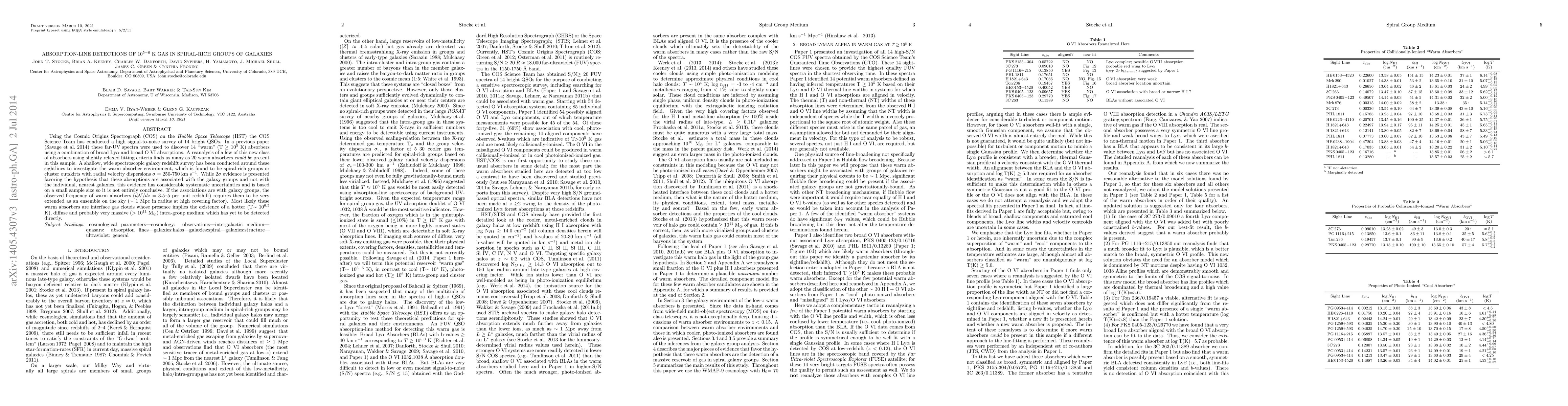 Using the Cosmic Origins Spectrograph (COS) on the Hubble Space Telescope (HST) the COS Science Team has conducted a high signal-to-noise survey of 14 bright QSOs. In a previous paper (Savage et al. 2014) these far-UV spectra were used to discover 14 "warm" ($T > 10^5$ K) absorbers using a combination of broad Ly\alpha\ and O VI absorptions. A reanalysis of a few of this new class of absorbers using slightly relaxed fitting criteria finds as many as 20 warm absorbers could be present in this sample. A shallow, wide spectroscopic galaxy redshift survey has been conducted around these sight lines to investigate the warm absorber environment, which is found to be spiral-rich galaxy groups or cluster outskirts with radial velocity dispersions of \sigma\ = 250-750 km/s. While 2\sigma\ evidence is presented favoring the hypothesis that these absorptions are associated with the galaxy groups and not with the individual, nearest galaxies, this evidence has considerable systematic uncertainties and is based on a small sample size so it is not entirely conclusive. If the associations are with galaxy groups, the observed frequency of warm absorbers (dN/dz = 3.5-5 per unit redshift) requires them to be very large (~1 Mpc in radius at high covering factor). Most likely these warm absorbers are interface gas clouds whose presence implies the existence of a hotter ($T \sim 10^{6.5}$ K), diffuse and probably very massive ($>10^{11}~M_{\odot}$) intra-group medium which has yet to be detected directly.