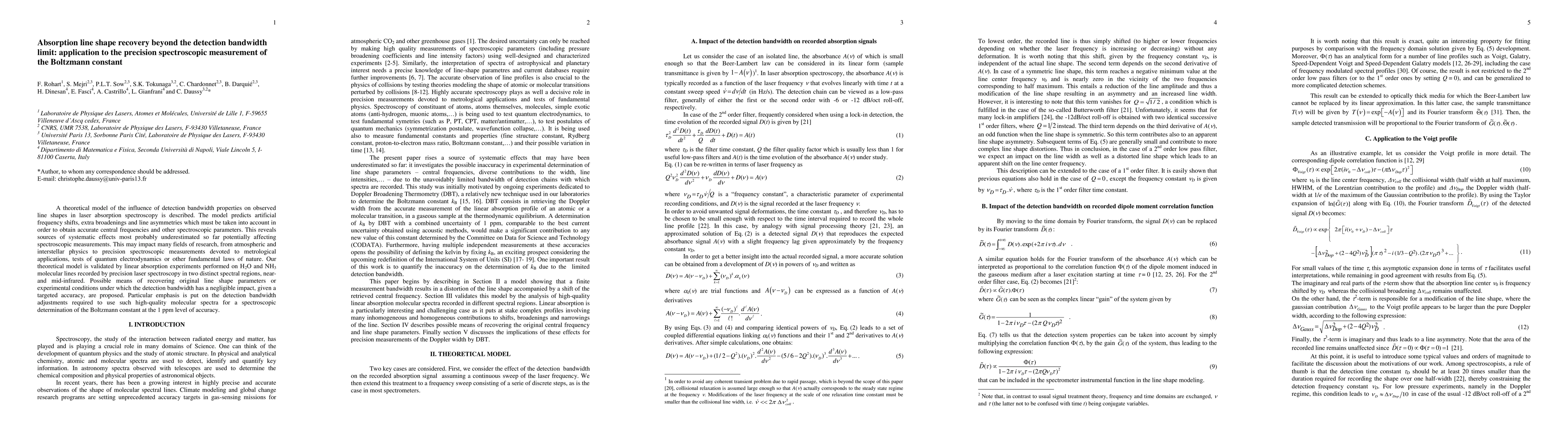 This paper presents a theoretical model addressing the impact of detection bandwidth on absorption line shapes in laser spectroscopy, revealing systematic errors that can affect precision measurements. The model is validated through experiments on H2O and NH3, and it proposes methods for recovering original line shapes to achieve high-accuracy determinations, such as the Boltzmann constant at 1 ppm precision.
