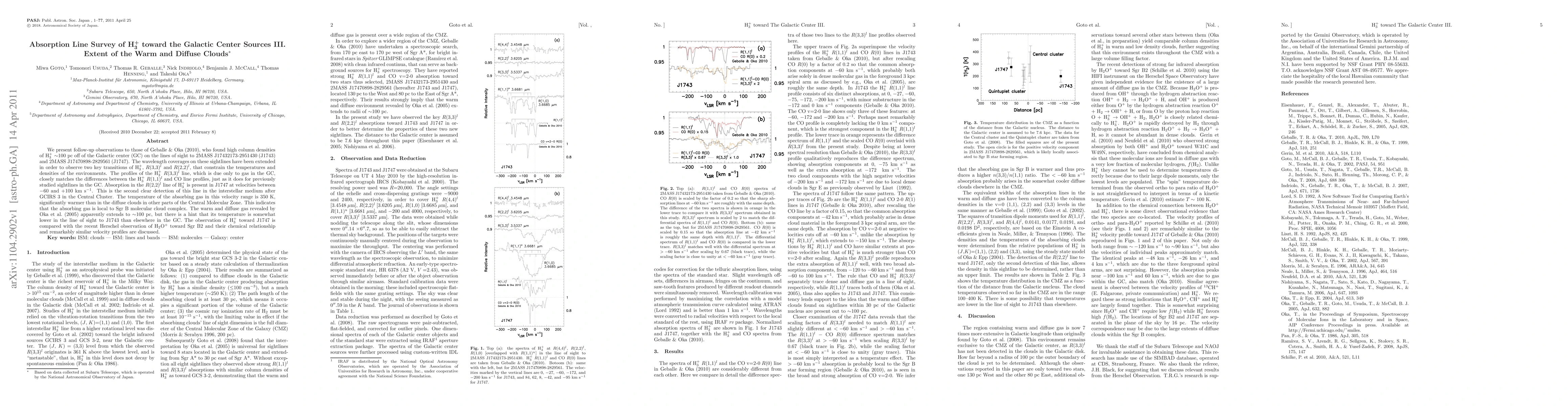 This study extends observations of H3+ absorption lines toward the Galactic Center sources J1743 and J1747, revealing warm and diffuse gas extending ~100 pc from the center. The H3+ R(2,2)l line shows absorption at 350 K in J1747, suggesting local gas associated with the Sgr B molecular cloud complex, while J1743 shows slightly cooler temperatures.