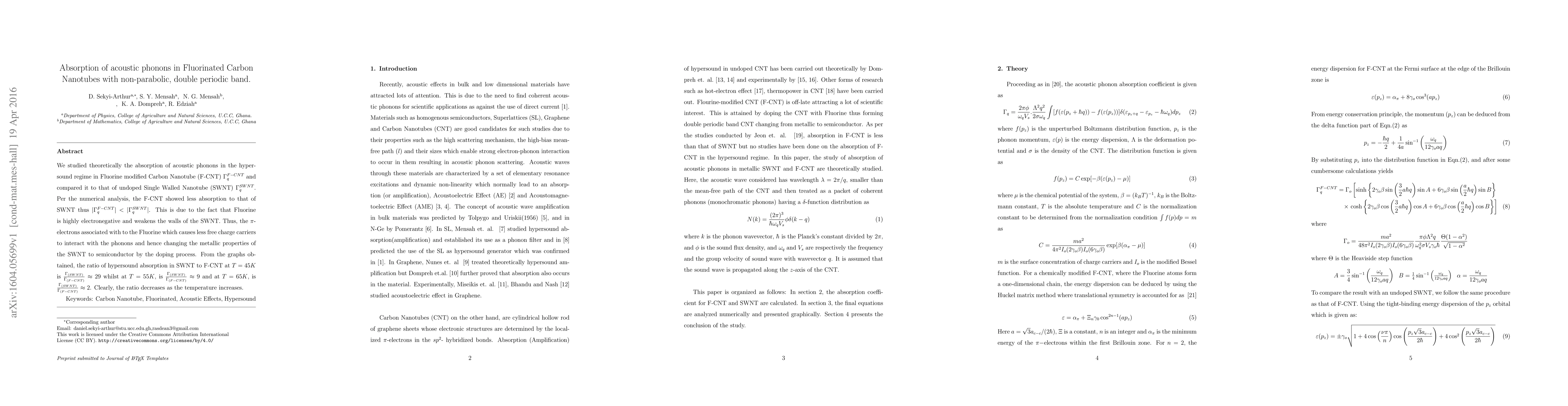 We studied theoretically the absorption of acoustic phonons in the hypersound regime in Fluorine modified Carbon Nanotube (F-CNT) $\Gamma_q^{F-CNT}$ and compared it to that of undoped Single Walled Nanotube (SWNT) $\Gamma_q^{SWNT}$. Per the numerical analysis, the F-CNT showed less absorption to that of SWNT thus $\vert\Gamma_q^{F-CNT}\vert < \vert\Gamma_q^{SWNT}\vert $. This is due to the fact that Fluorine is highly electronegative and weakens the walls of the SWNT. Thus, the $\pi$-electrons associated with to the Fluorine which causes less free charge carriers to interact with the phonons and hence changing the metallic properties of the SWNT to semiconductor by the doping process. From the graphs obtained, the ratio of hypersound absorption in SWNT to F-CNT at $T = 45K$ is $\frac{\Gamma_{(SWNT)}}{\Gamma_{(F-CNT)}}\approx 29$ whilst at $T = 55K$, is $\frac{\Gamma_{(SWNT)}}{\Gamma_{(F-CNT)}}\approx 9$ and at $T = 65K$, is $\frac{\Gamma_{(SWNT)}}{\Gamma_{(F-CNT)}}\approx 2$. Clearly, the ratio decreases as the temperature increases.