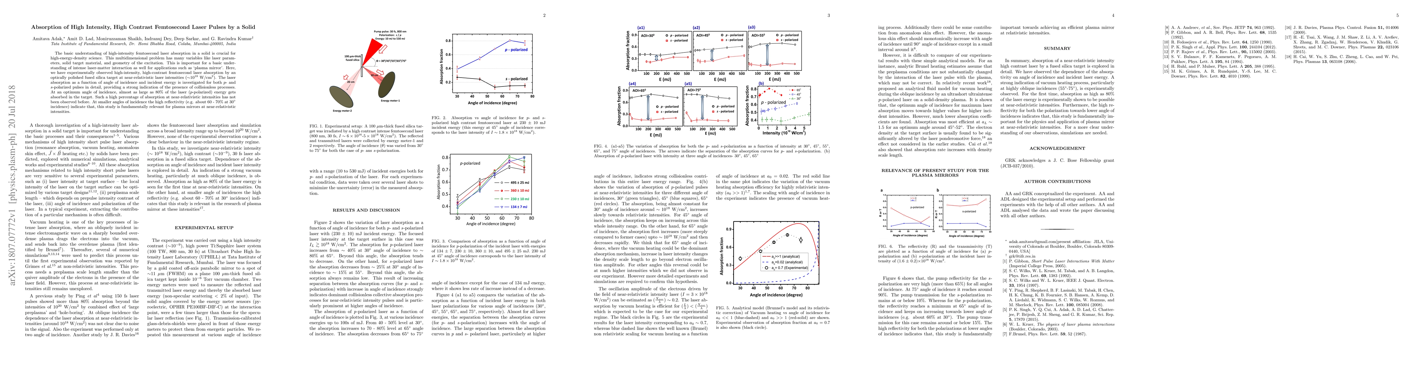 The basic understanding of high-intensity femtosecond laser absorption in a solid is crucial for high-energy-density science. This multidimensional problem has many variables like laser parameters, solid target material, and geometry of the excitation. This is important for a basic understanding of intense laser-matter interaction as well for applications such as `plasma mirror'. Here, we have experimentally observed high-intensity, high-contrast femtosecond laser absorption by an optically polished fused silica target at near-relativistic laser intensities ($\sim$10$^{18}$ W/cm$^2$). The laser absorption as a function of angle of incidence and incident energy is investigated for both $p$- and $s$-polarized pulses in detail, providing a strong indication of the presence of collisionless processes. At an optimum angle of incidence, almost as large as 80% of the laser ($p$-polarized) energy gets absorbed in the target. Such a high percentage of absorption at near-relativistic intensities has not been observed before. At smaller angles of incidence the high reflectivity (e.g. about 60 - 70% at 30$^\circ$ incidence) indicate that, this study is fundamentally relevant for plasma mirrors at near-relativistic intensities.