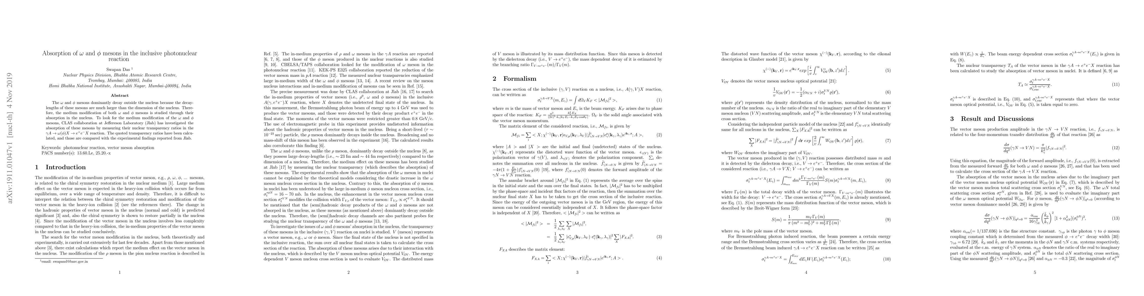 The $\omega$ and $\phi$ mesons dominantly decay outside the nucleus because the decay-lengths of them are much larger than the dimension of the nucleus. Therefore, the medium modification of the above mesons is studied through their absorption in the nucleus. CLAS collaboration at Jefferson Laboratory (Jlab) has investigated the absorption of the $\omega$ and $\phi$ mesons by measuring the nuclear transparency ratios for them in the $\gamma A \to \omega (\phi) X \to e^+e^-X$ reaction. The nuclear transparency ratios for both $\omega$ and $\phi$ mesons in the above reactions have been calculated, and those are compared with the experimental findings, reported from Jlab, to estimate the $\omega$ meson nucleon and $\phi$ meson nucleon cross sections in the nucleus.