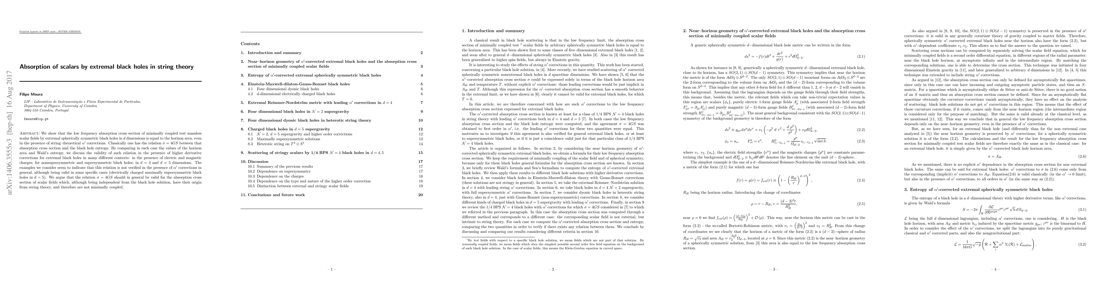 This paper demonstrates that the absorption cross section of massless scalar fields by extremal black holes equals the horizon area, even with string-theoretical $\alpha'$ corrections, challenging the classical relation $\sigma = 4 G S$. The study finds that while this relation holds in some specific cases, it generally does not apply in the presence of $\alpha'$ corrections.
