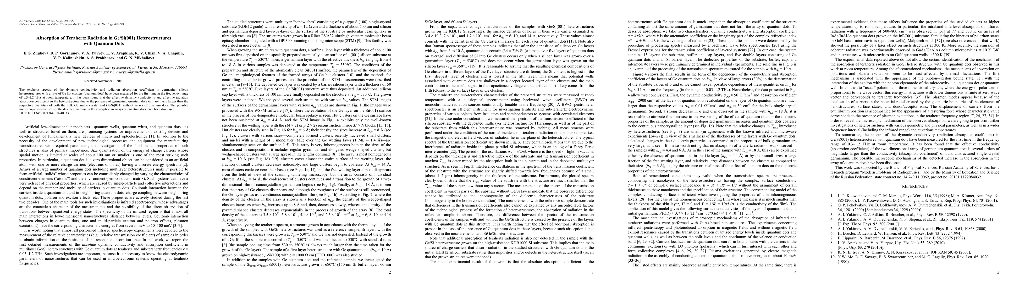 This paper reports the first measurements of terahertz spectra in Ge/Si(001) heterostructures with Ge quantum dots, revealing significantly higher dynamic conductivity and absorption coefficient compared to bulk Ge and Ge/Si(001) without quantum dots, with discussed microscopic mechanisms for this enhancement.