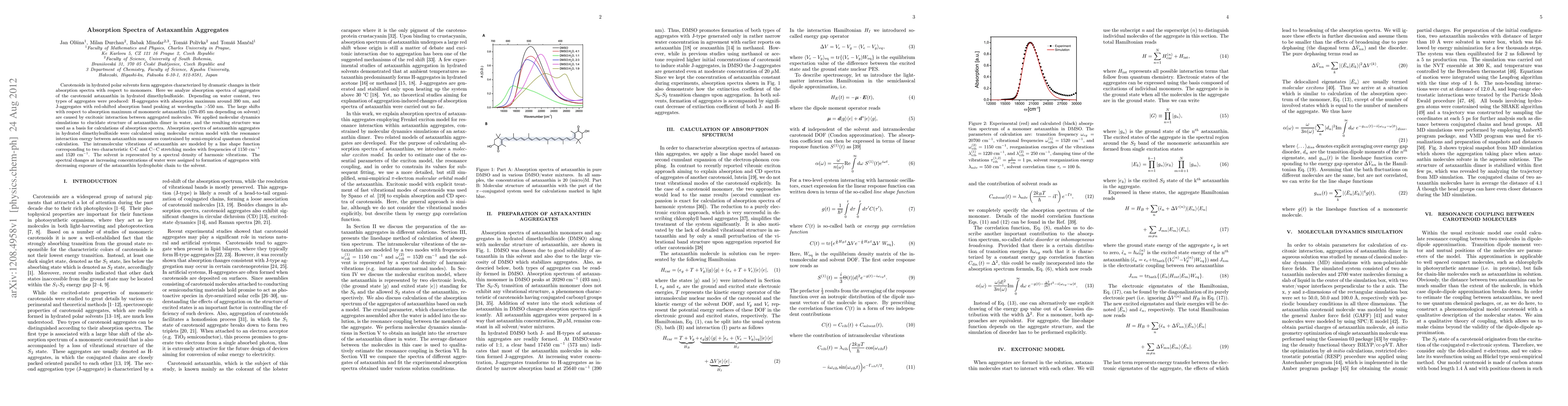 This paper investigates the absorption spectra of astaxanthin aggregates in hydrated dimethylsulfoxide, identifying two types: H-aggregates with a peak around 390 nm and J-aggregates with a red-shifted peak above 550 nm. The spectral shifts are attributed to excitonic interactions between aggregated molecules.