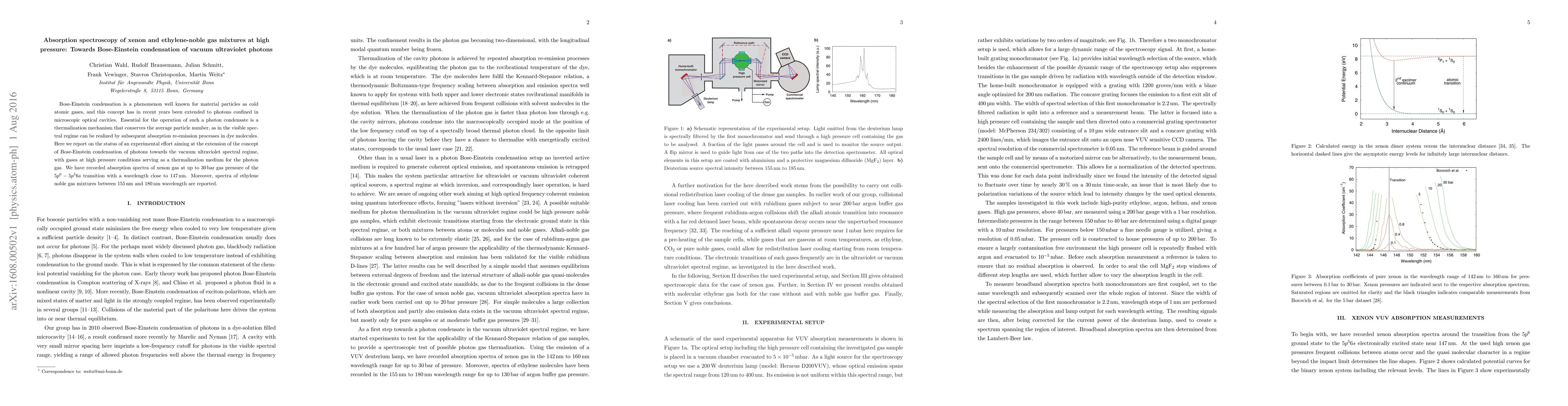 This paper details experimental efforts to extend Bose-Einstein condensation to vacuum ultraviolet photons using high-pressure xenon and ethylene-noble gas mixtures as thermalization media. It reports on absorption spectroscopy of xenon and ethylene-noble gas mixtures, focusing on the $5p^6 - 5p^56s$ transition in xenon and the 155-180 nm wavelength range.