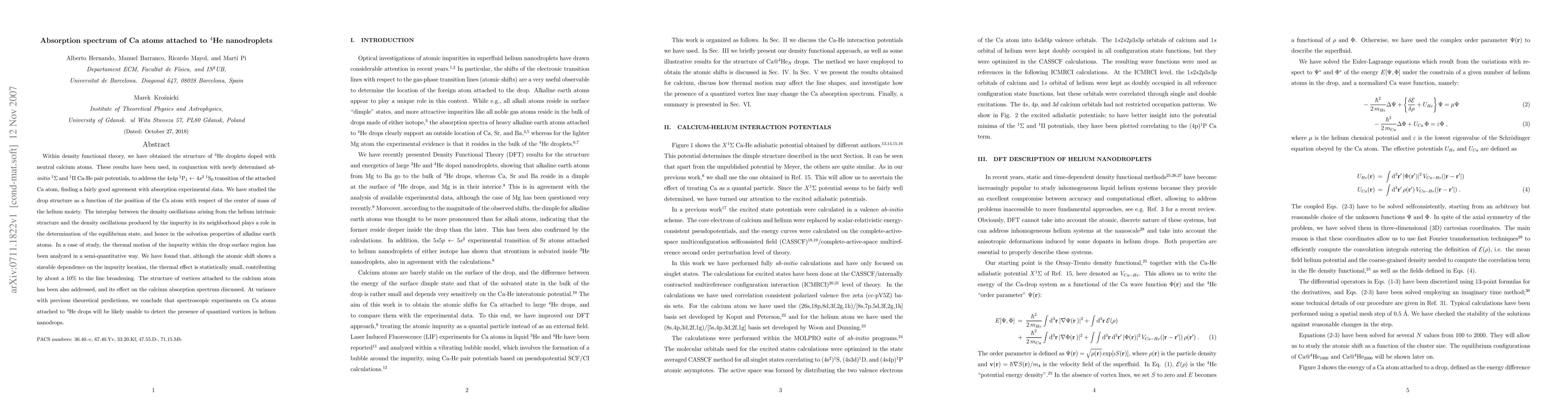 Within density functional theory, we have obtained the structure of $^4$He droplets doped with neutral calcium atoms. These results have been used, in conjunction with newly determined {\it ab-initio} $^1\Sigma$ and $^1\Pi$ Ca-He pair potentials, to address the $4s4p$ $^1$P$_1 \leftarrow 4s^2$ $^1$S$_0$ transition of the attached Ca atom, finding a fairly good agreement with absorption experimental data. We have studied the drop structure as a function of the position of the Ca atom with respect of the center of mass of the helium moiety. The interplay between the density oscillations arising from the helium intrinsic structure and the density oscillations produced by the impurity in its neighborhood plays a role in the determination of the equilibrium state, and hence in the solvation properties of alkaline earth atoms. In a case of study, the thermal motion of the impurity within the drop surface region has been analyzed in a semi-quantitative way. We have found that, although the atomic shift shows a sizeable dependence on the impurity location, the thermal effect is statistically small, contributing by about a 10% to the line broadening. The structure of vortices attached to the calcium atom has been also addressed, and its effect on the calcium absorption spectrum discussed. At variance with previous theoretical predictions, we conclude that spectroscopic experiments on Ca atoms attached to $^4$He drops will be likely unable to detect the presence of quantized vortices in helium nanodrops.