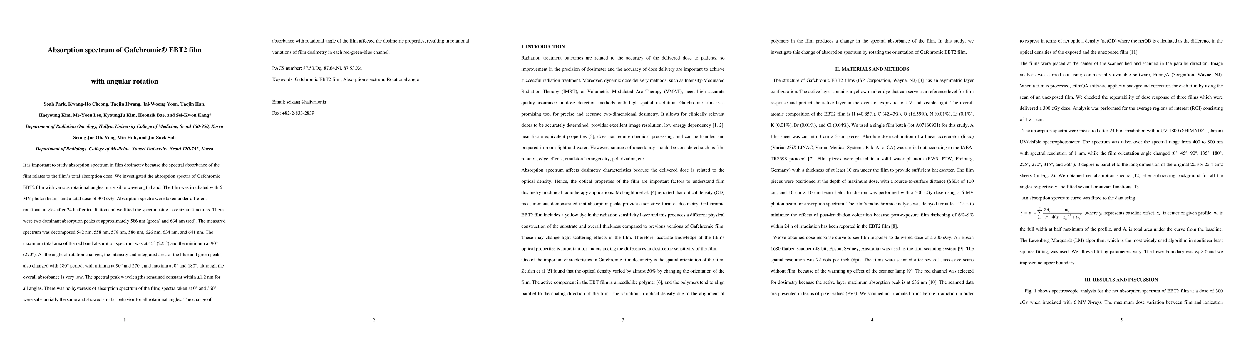 This study investigates the absorption spectrum of Gafchromic EBT2 film with varying angular rotation, revealing two dominant peaks at 586 nm and 634 nm. The red band's maximum absorption occurs at 45° (225°) and minimum at 90° (270°), while blue and green peaks exhibit 180° periodic changes. The spectral peak wavelengths remain constant, indicating no hysteresis in the film's absorption spectrum.