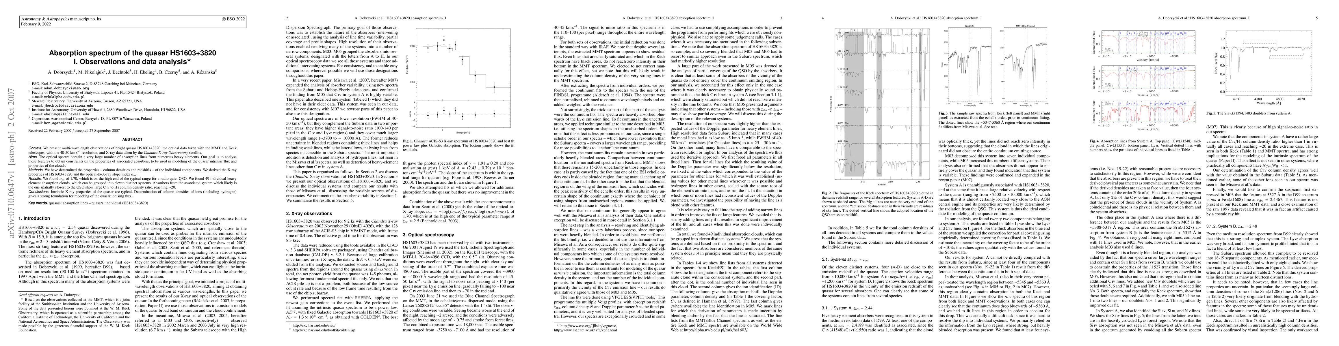 We present the analysis of multi-wavelength observations of bright quasar HS1603+3820: the optical data taken with the MMT and Keck telescopes, and X-ray data obtained with the Chandra X-ray Observatory. The optical spectra contain a very large number of absorption lines from numerous heavy elements. We derived X-ray properties of HS1603. The quasar has the optical-to-X-ray slope index alpha_ox of 1.70, which is on the high end of the typical range for radio quiet QSOs. We found 49 individual heavy element absorption clouds, which can be grouped into eleven distinct systems. We determined column densities and redshifts of the individual components. Absorbers from the associated system which is likely spatially closest to the QSO show large CIV to HI column density ratio, reaching ca.20.