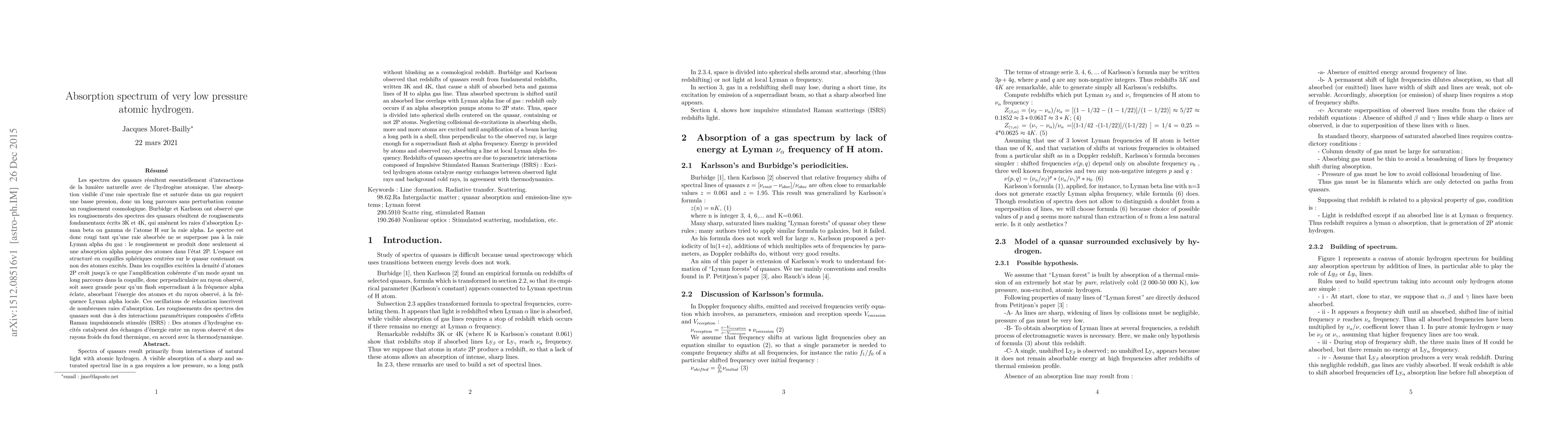 Spectra of quasars result primarily from interactions of natural light with atomic hydrogen. A visible absorption of a sharp and saturated spectral line in a gas requires a low pressure, so a long path without blushing as a cosmological redshift. Burbidge and Karlsson observed that redshifts of quasars result from fundamental redshifts, written 3K and 4K, that cause a shift of absorbed beta and gamma lines of H to alpha gas line. Thus absorbed spectrum is shifted until an absorbed line overlaps with Lyman alpha line of gas: redshift only occurs if an alpha absorption pumps atoms to 2P state. Thus, space is divided into spherical shells centered on the quasar, containing or not 2P atoms. Neglecting collisional de-excitations in absorbing shells, more and more atoms are excited until amplification of a beam having a long path in a shell, thus perpendicular to the observed ray, is large enough for a superradiant flash at alpha frequency. Energy is provided by atoms and observed ray, absorbing a line at local Lyman alpha frequency. Redshifts of quasars spectra are due to parametric interactions composed of Impulsive Stimulated Raman Scatterings (ISRS) : Excited hydrogen atoms catalyze energy exchanges between observed light rays and background cold rays, in agreement with thermodynamics.