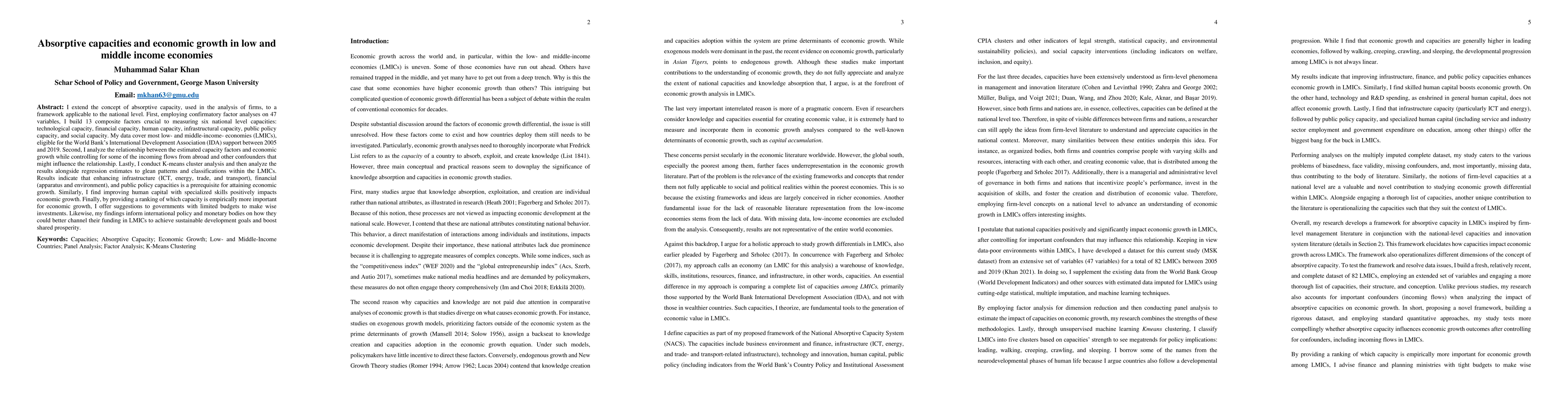 This research extends the concept of absorptive capacity from firms to national economies, identifying 13 composite factors to measure six national capacities and analyzing their impact on economic growth in low- and middle-income countries (LMICs). It finds that enhancing infrastructure, financial capacity, and human capital are crucial for economic growth, offering policy recommendations for targeted investments.