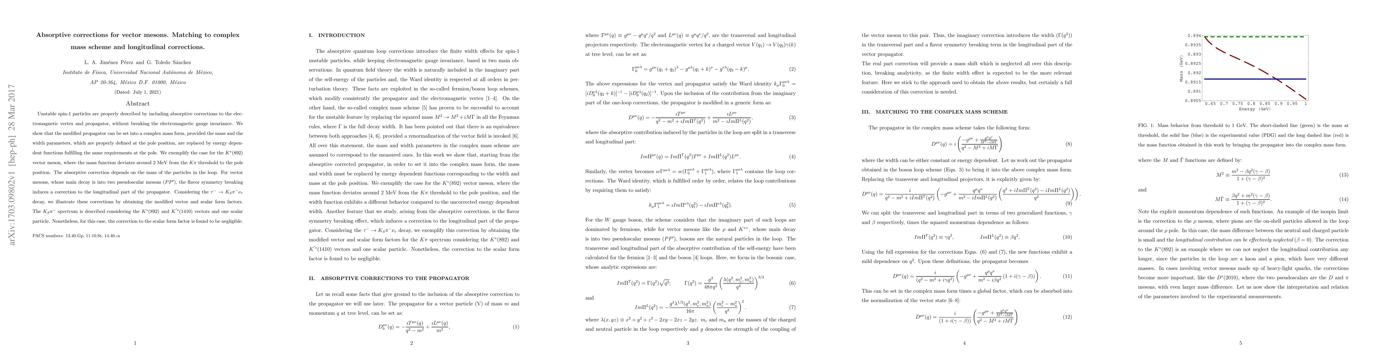Unstable spin-1 particles are properly described by including absorptive corrections to the electromagnetic vertex and propagator, without breaking the electromagnetic gauge invariance. We show that the modified propagator can be set into a complex mass form, provided the mass and the width parameters, which are properly defined at the pole position, are replaced by energy dependent functions fulfilling the same requirements at the pole. We exemplify the case for the $K^*(892)$ vector meson, where the mass function deviates around 2 MeV from the $K\pi$ threshold to the pole position. The absorptive correction depends on the mass of the particles in the loop. For vector mesons, whose main decay is into two pseudoscalar mesons ($PP'$), the flavor symmetry breaking induces a correction to the longitudinal part of the propagator. Considering the $\tau^- \to K_S\pi^-\nu_\tau$ decay, we illustrate these corrections by obtaining the modified vector and scalar form factors. The $K_S\pi^-$ spectrum is described considering the $K^*(892)$ and $K^{'*}(1410)$ vectors and one scalar particle. Nonetheless, for this case, the correction to the scalar form factor is found to be negligible.