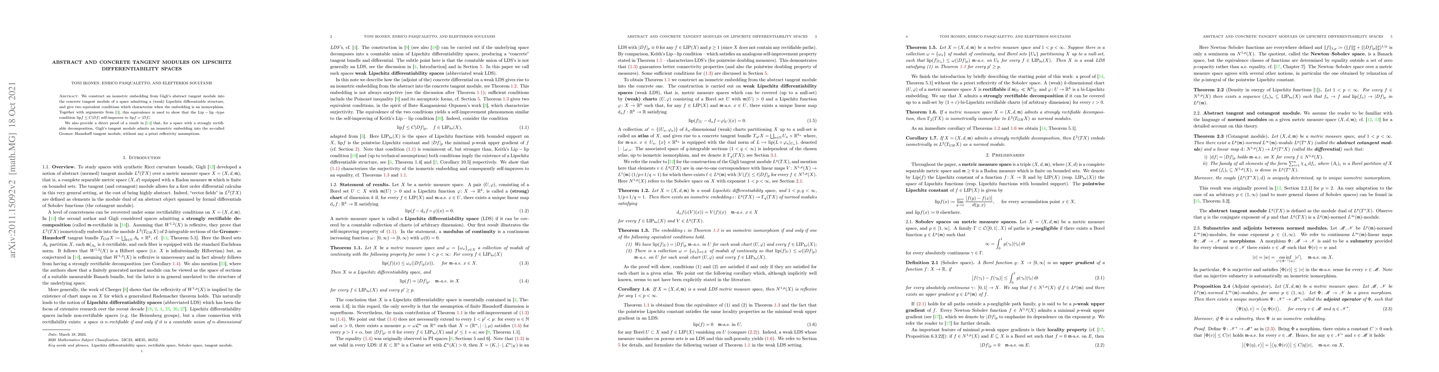 This paper constructs an isometric embedding from an abstract tangent module into a concrete tangent module for spaces with Lipschitz differentiability and characterizes conditions for this embedding to be an isomorphism. It demonstrates that certain Lipschitz conditions imply the existence of a differentiable structure and self-improve to equality. Additionally, it provides a direct proof of an embedding of Gigli's tangent module into the Gromov-Hausdorff tangent module without reflexivity assumptions.