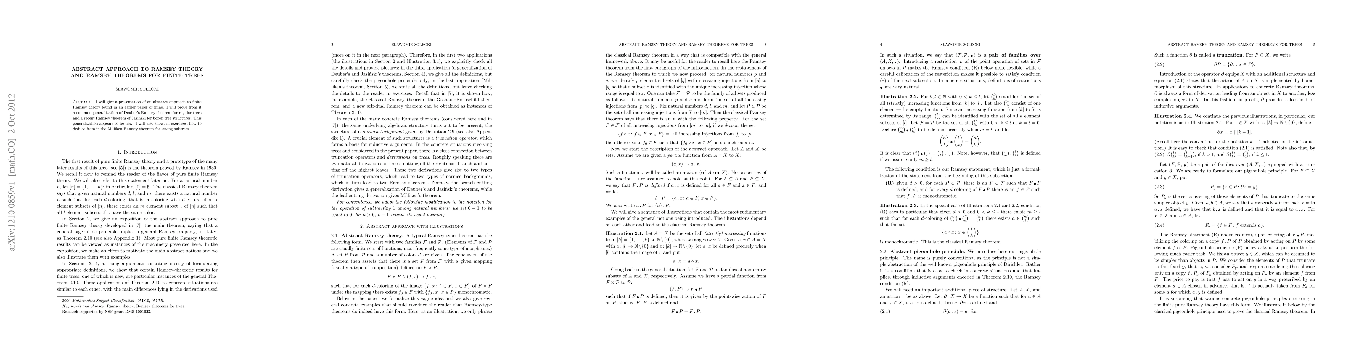 I will give a presentation of an abstract approach to finite Ramsey theory found in an earlier paper of mine. I will prove from it a common generalization of Deuber's Ramsey theorem for regular trees and a recent Ramsey theorem of Jasinski for boron tree structures. This generalization appears to be new. I will also show, in exercises, how to deduce from it the Milliken Ramsey theorem for strong subtrees.