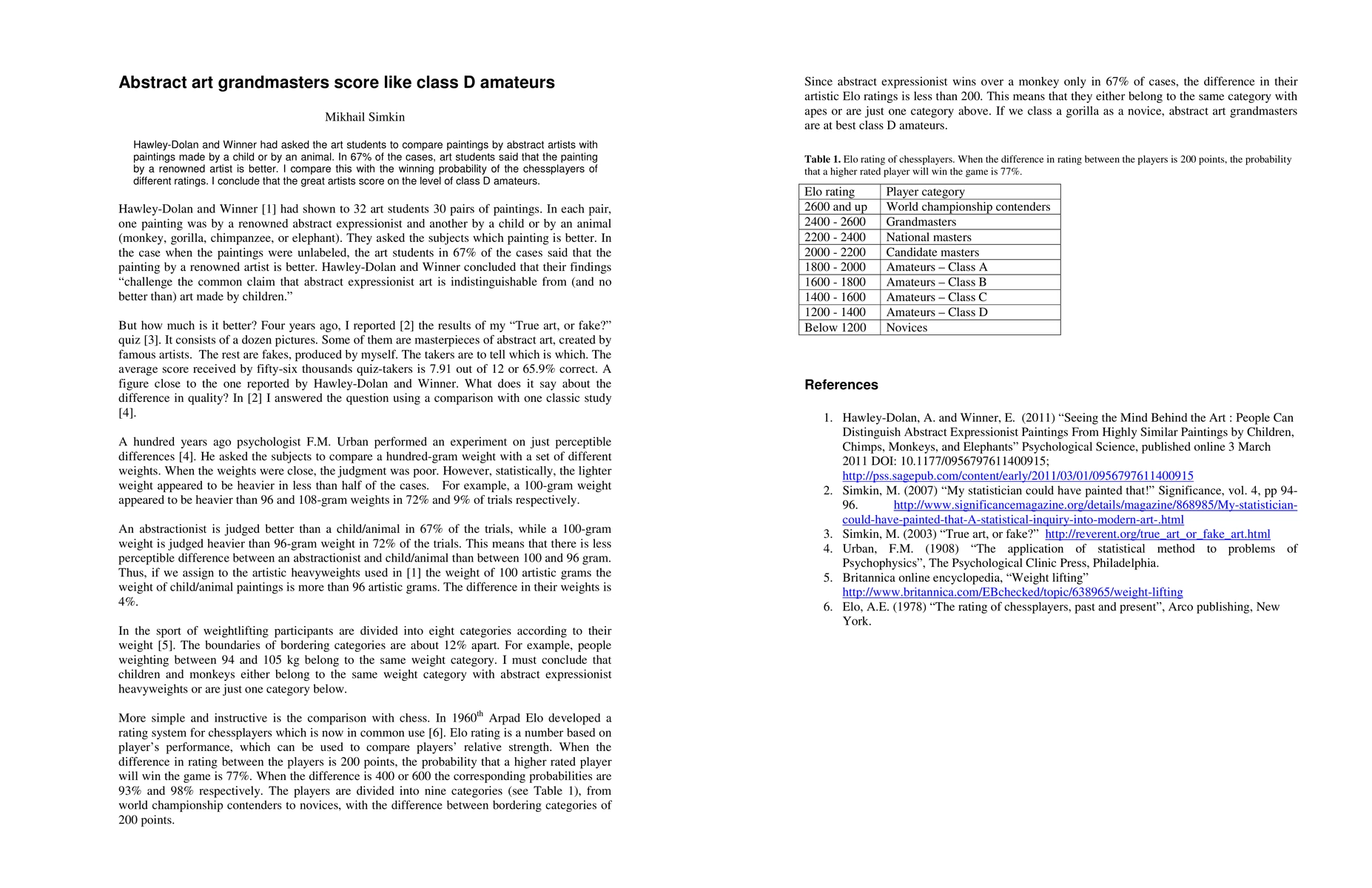 Hawley-Dolan and Winner had asked the art students to compare paintings by abstract artists with paintings made by a child or by an animal. In 67% of the cases, art students said that the painting by a renowned artist is better. I compare this with the winning probability of the chessplayers of different ratings. I conclude that the great artists score on the level of class D amateurs.