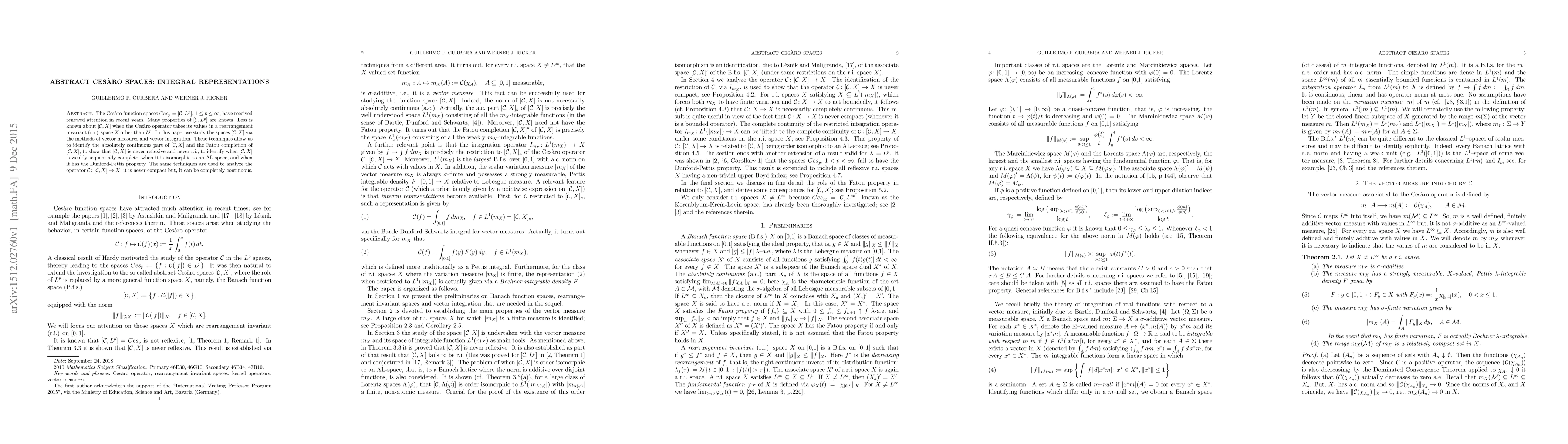 The Ces\`aro function spaces $Ces_p=[C,L^p]$, $1\le p\le\infty$, have received renewed attention in recent years. Many properties of $[C,L^p]$ are known. Less is known about $[C,X]$ when the Ces\`aro operator takes its values in a rearrangement invariant (r.i.) space $X$ other than $L^p$. In this paper we study the spaces $[C,X]$ via the methods of vector measures and vector integration. These techniques allow us to identify the absolutely continuous part of $[C,X]$ and the Fatou completion of $[C,X]$; to show that $[C,X]$ is never reflexive and never r.i.; to identify when $[C,X]$ is weakly sequentially complete, when it is isomorphic to an AL-space, and when it has the Dunford-Pettis property. The same techniques are used to analyze the operator $C:[C,X]\to X$; it is never compact but, it can be completely continuous.