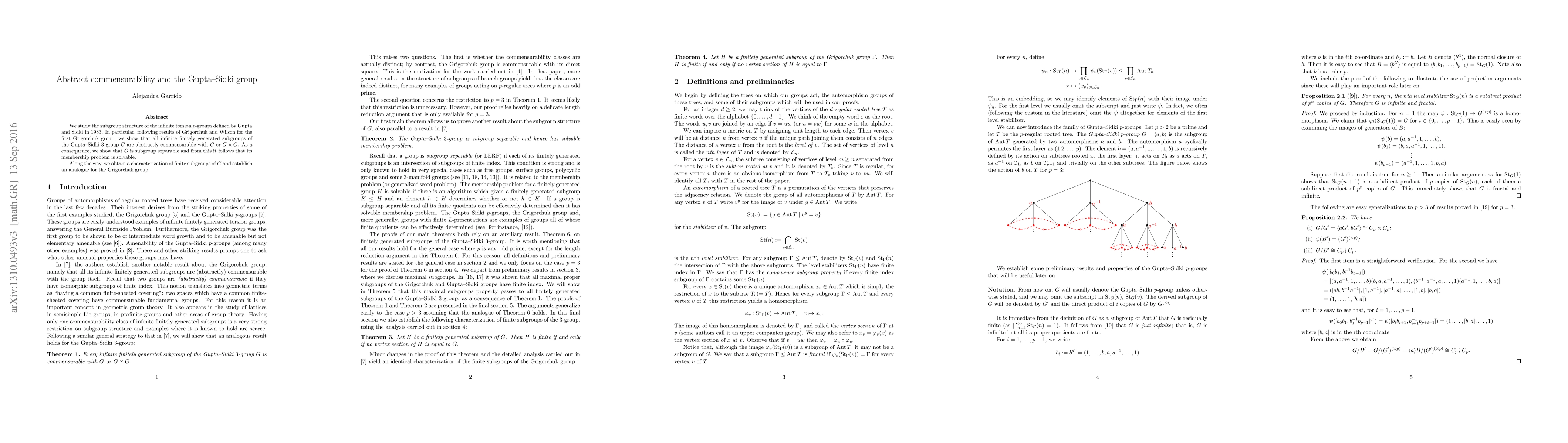 We study the subgroup structure of the infinite torsion $p$-groups defined by Gupta and Sidki in 1983. In particular, following results of Grigorchuk and Wilson for the first Grigorchuk group, we show that all infinite finitely generated subgroups of the Gupta--Sidki 3-group $G$ are abstractly commensurable with $G$ or $G\times G$. As a consequence, we show that $G$ is subgroup separable and from this it follows that its membership problem is soluble. Along the way, we obtain a characterization of finite subgroups of $G$ and establish an analogue for the Grigorchuk group.