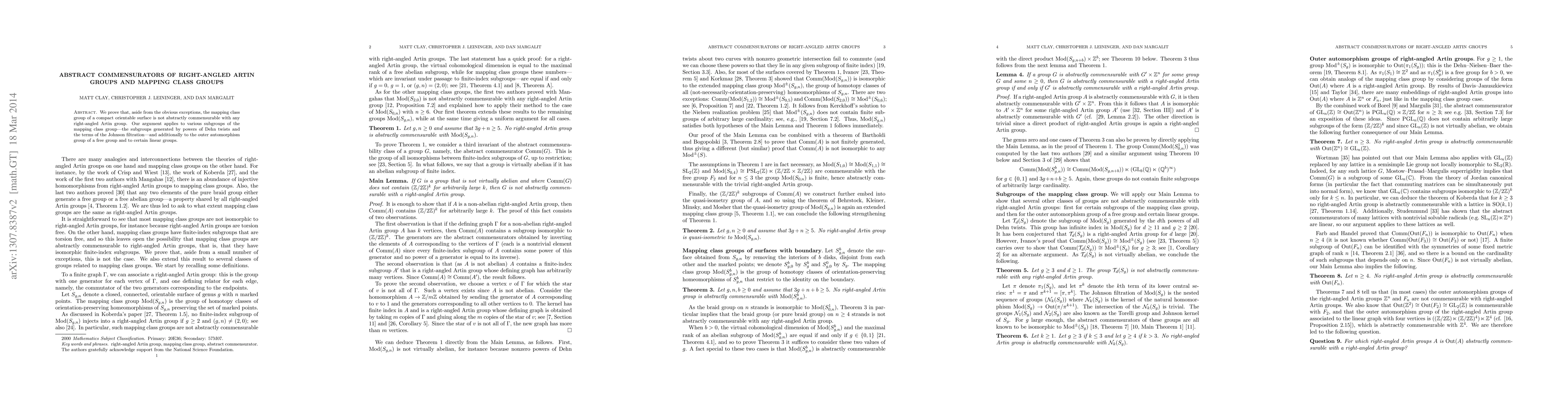 The paper demonstrates that, barring clear exceptions, the mapping class group of a compact orientable surface cannot be abstractly commensurated with any right-angled Artin group, applying this argument to various subgroups of the mapping class group and other relevant groups.