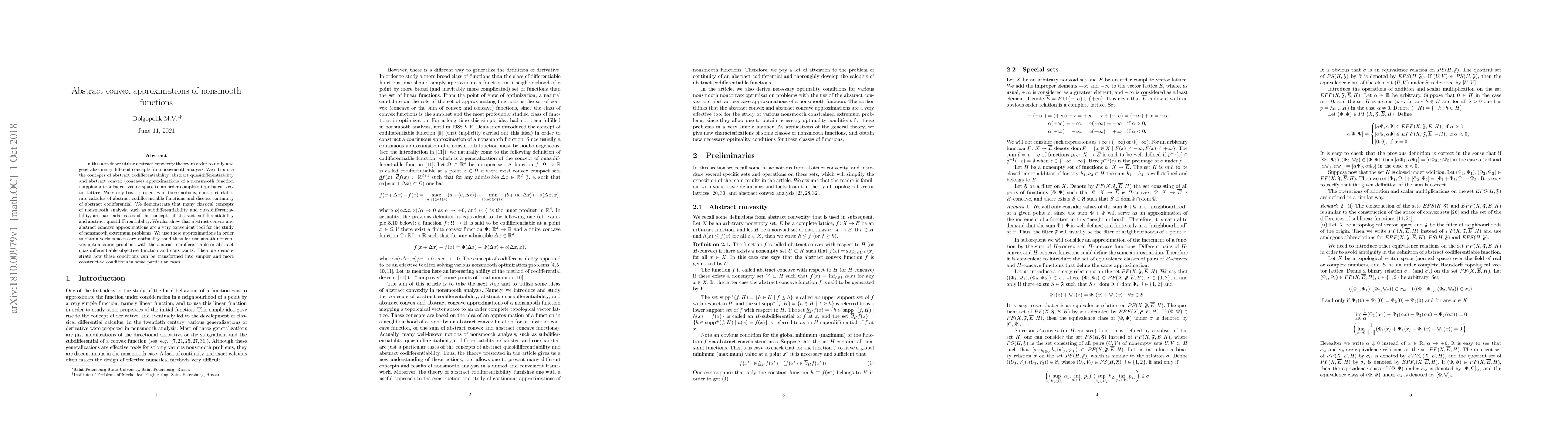 In this article we utilise abstract convexity theory in order to unify and generalize many different concepts from nonsmooth analysis. We introduce the concepts of abstract codifferentiability, abstract quasidifferentiability and abstract convex (concave) approximations of a nonsmooth function mapping a topological vector space to an order complete topological vector lattice. We study basic properties of these notions, construct elaborate calculus of abstract codifferentiable functions and discuss continuity of abstract codifferential. We demonstrate that many classical concepts of nonsmooth analysis, such as subdifferentiability and quasidifferentiability, are particular cases of the concepts of abstract codifferentiability and abstract quasidifferentiability. We also show that abstract convex and abstract concave approximations are a very convenient tool for the study of nonsmooth extremum problems. We use these approximations in order to obtain various necessary optimality conditions for nonsmooth nonconvex optimization problems with the abstract codifferentiable or abstract quasidifferentiable objective function and constraints. Then we demonstrate how these conditions can be transformed into simpler and more constructive conditions in some particular cases.