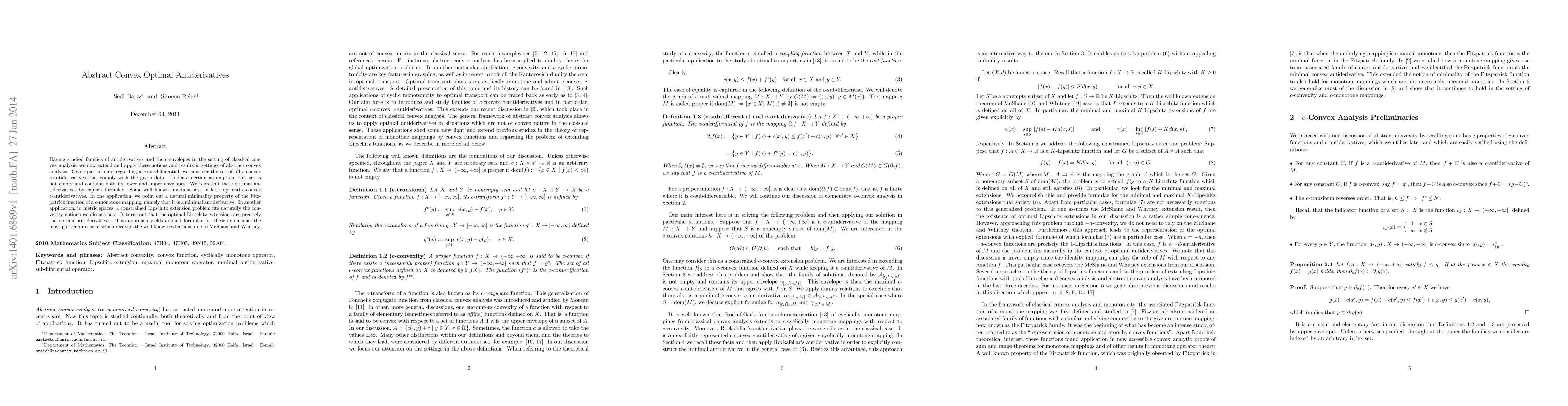 Having studied families of antiderivatives and their envelopes in the setting of classical convex analysis, we now extend and apply these notions and results in settings of abstract convex analysis. Given partial data regarding a c-subdifferential, we consider the set of all c-convex c-antiderivatives that comply with the given data. Under a certain assumption, this set is not empty and contains both its lower and upper envelopes. We represent these optimal antiderivatives by explicit formulae. Some well known functions are, in fact, optimal c-convex c-antiderivatives. In one application, we point out a natural minimality property of the Fitzpatrick function of a c-monotone mapping, namely that it is a minimal antiderivative. In another application, in metric spaces, a constrained Lipschitz extension problem fits naturally the convexity notions we discuss here. It turns out that the optimal Lipschitz extensions are precisely the optimal antiderivatives. This approach yields explicit formulae for these extensions, the most particular case of which recovers the well known extensions due to McShane and Whitney.