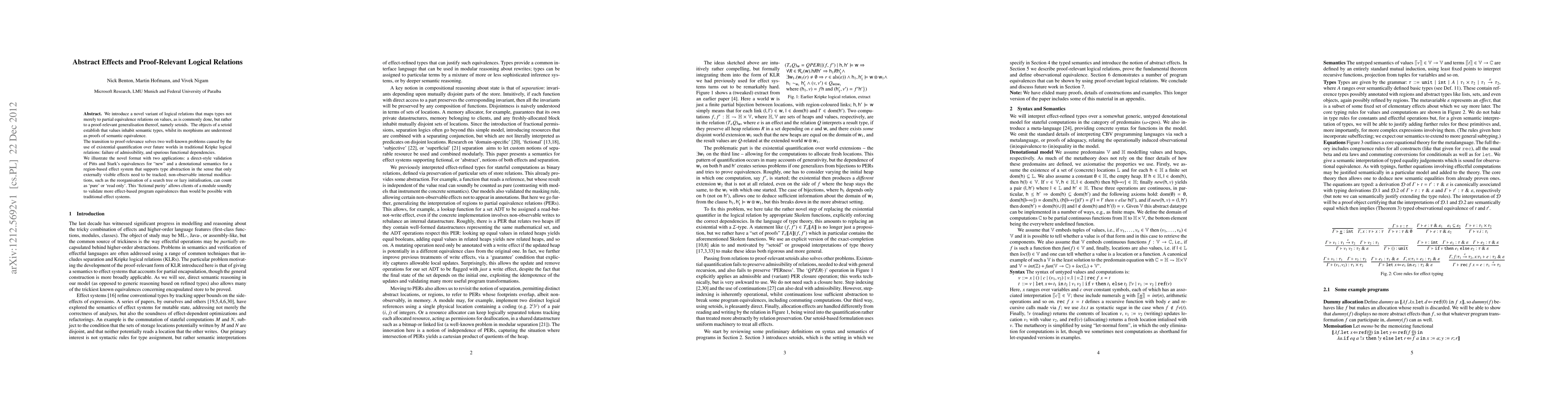 We introduce a novel variant of logical relations that maps types not merely to partial equivalence relations on values, as is commonly done, but rather to a proof-relevant generalisation thereof, namely setoids. The objects of a setoid establish that values inhabit semantic types, whilst its morphisms are understood as proofs of semantic equivalence. The transition to proof-relevance solves two well-known problems caused by the use of existential quantification over future worlds in traditional Kripke logical relations: failure of admissibility, and spurious functional dependencies. We illustrate the novel format with two applications: a direct-style validation of Pitts and Stark's equivalences for "new" and a denotational semantics for a region-based effect system that supports type abstraction in the sense that only externally visible effects need to be tracked; non-observable internal modifications, such as the reorganisation of a search tree or lazy initialisation, can count as `pure' or `read only'. This `fictional purity' allows clients of a module soundly to validate more effect-based program equivalences than would be possible with traditional effect systems.