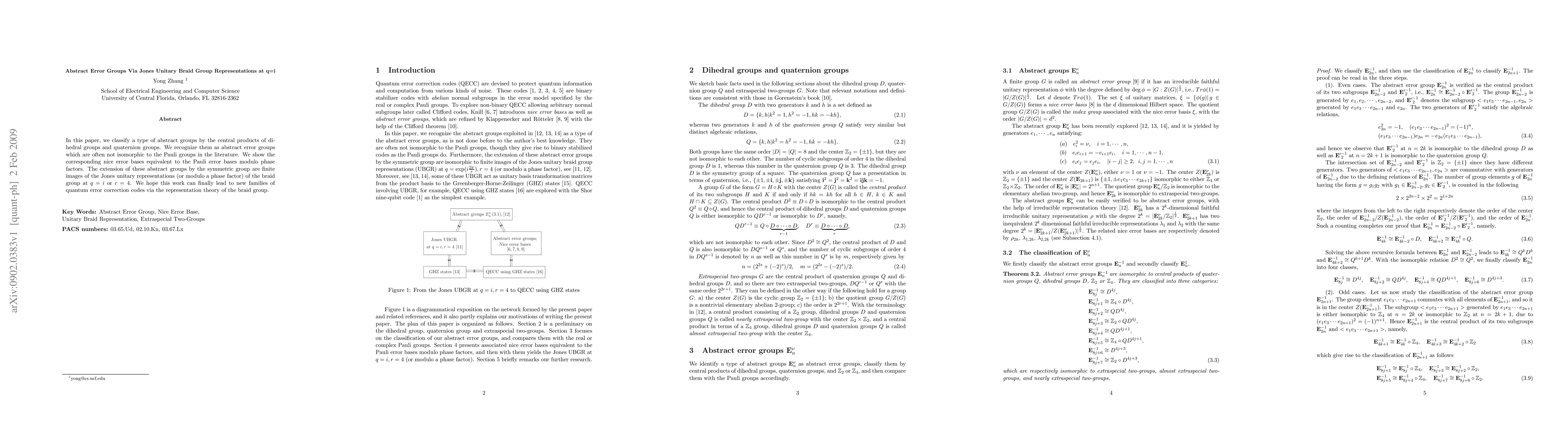 This paper classifies abstract error groups formed by central products of dihedral and quaternion groups, which differ from Pauli groups. It demonstrates their equivalence to Pauli error bases up to phase factors and shows their connection to Jones unitary braid group representations at q=i, potentially leading to new quantum error correction codes.