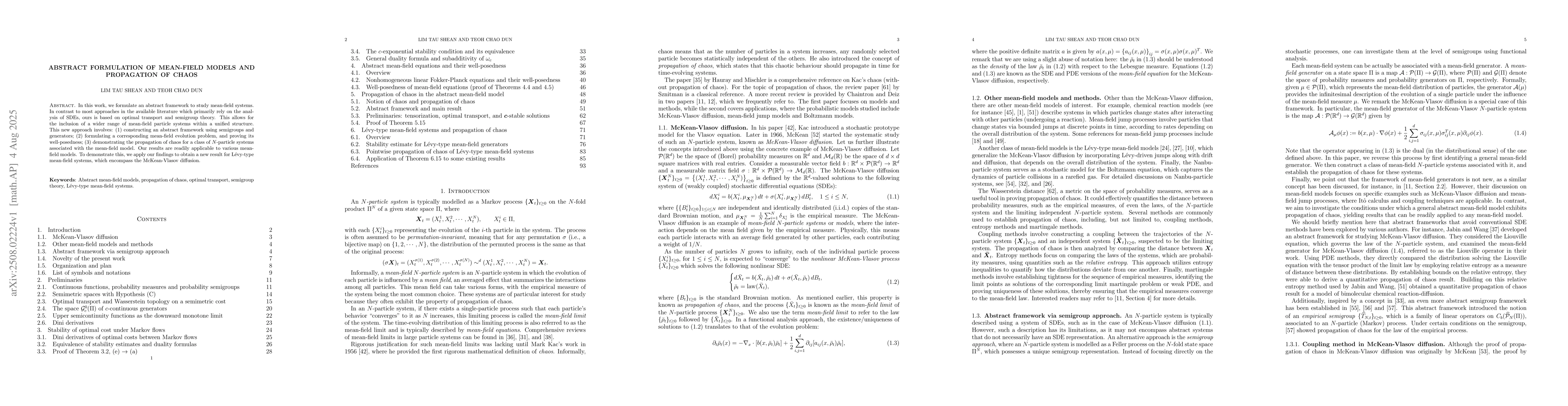 In this work, we formulate an abstract framework to study mean-field systems. In contrast to most approaches in the available literature which primarily rely on the analysis of SDEs, ours is based on optimal transport and semigroup theory. This allows for the inclusion of a wider range of mean-field particle systems within a unified structure. This new approach involves: (1) constructing an abstract framework using semigroups and generators; (2) formulating a corresponding mean-field evolution problem, and proving its well-posedness; (3) demonstrating the propagation of chaos for a class of N-particle systems associated with the mean-field model. Our results are readily applicable to various mean-field models. To demonstrate this, we apply our findings to obtain a new result for Levy-type mean-field systems, which encompass the McKean-Vlasov diffusion.