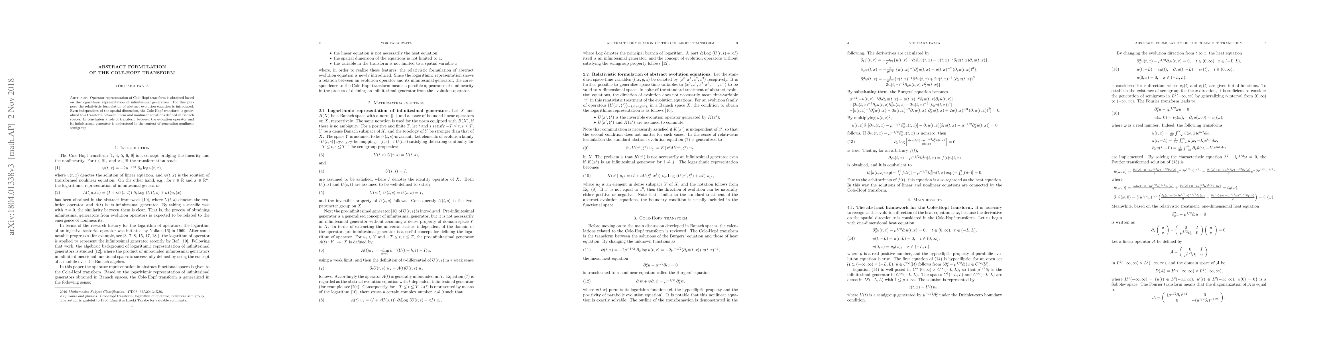 This paper develops an abstract formulation of the Cole-Hopf transform, a mathematical tool for transforming linear equations into nonlinear ones, using a relativistic evolution equation framework. The transformation is independent of spatial dimensions and has implications for understanding nonlinear semigroups.