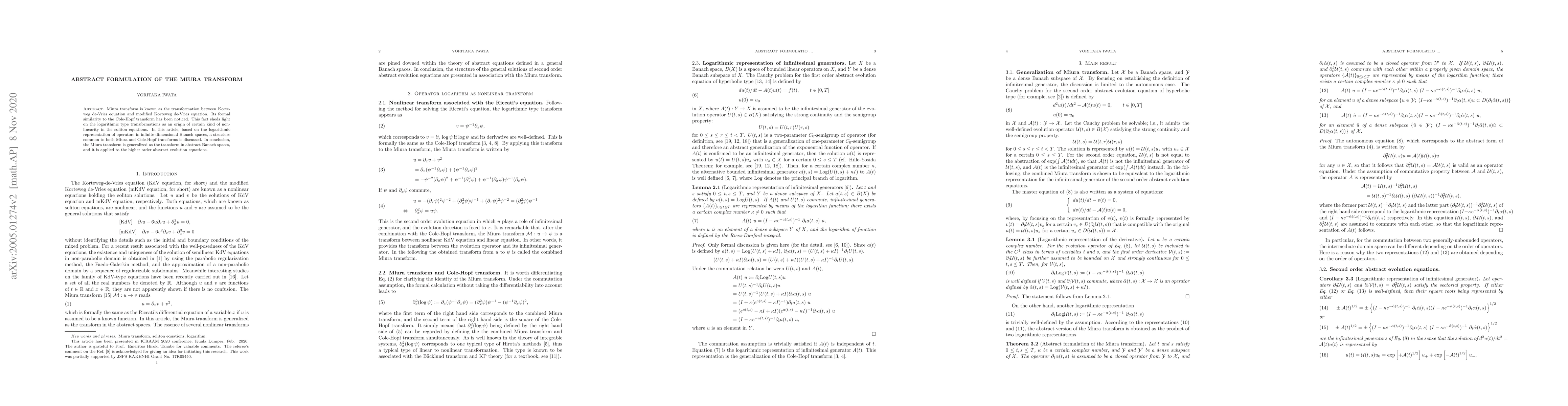 Miura transform is known as the transformation between Korteweg de-Vries equation and modified Korteweg de-Vries equation. Its formal similarity to the Cole-Hopf transform has been noticed. This fact sheds light on the logarithmic type transformations as an origin of certain kind of nonlinearity in the soliton equations. In this article, based on the logarithmic representation of operators in infinite-dimensional Banach spaces, a structure common to both Miura and Cole-Hopf transforms is discussed. In conclusion, the Miura transform is generalized as the transform in abstract Banach spaces, and it is applied to the higher order abstract evolution equations.