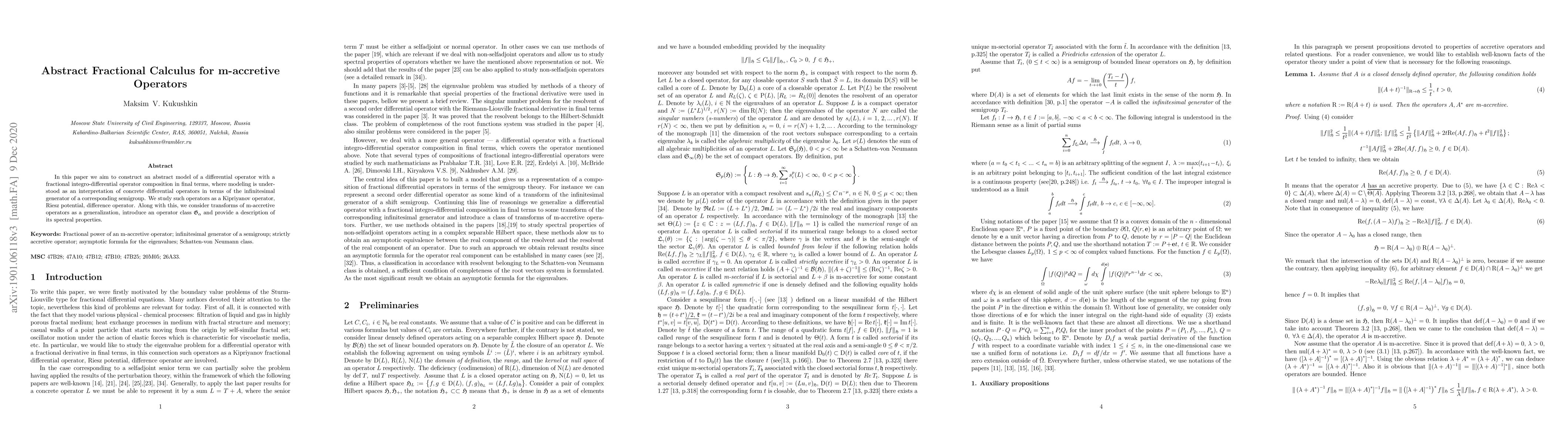 In this paper we aim to construct an abstract model of a differential operator with a fractional integro-differential operator composition in final terms, where modeling is understood as an interpretation of concrete differential operators in terms of the infinitesimal generator of a corresponding semigroup. We study such operators as a Kipriyanov operator, Riesz potential, difference operator. Along with this, we consider transforms of m-accretive operators as a generalization, introduce an operator class $\mathfrak{G_{\alpha}}$ and provide a description of its spectral properties.
