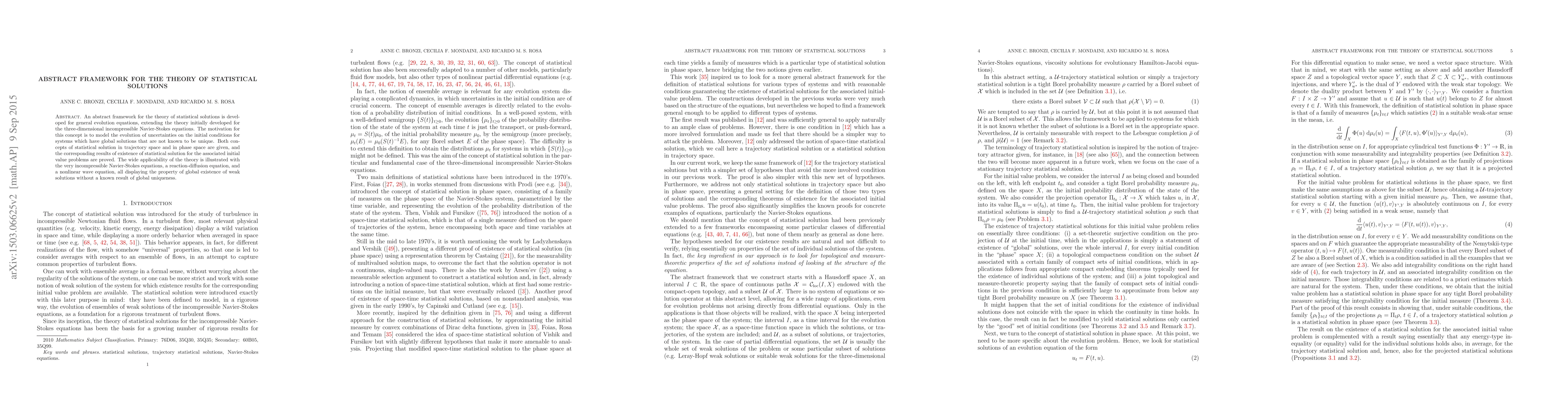 An abstract framework for the theory of statistical solutions is developed for general evolution equations, extending the theory initially developed for the three-dimensional incompressible Navier-Stokes equations. The motivation for this concept is to model the evolution of uncertainties on the initial conditions for systems which have global solutions that are not known to be unique. Both concepts of statistical solution in trajectory space and in phase space are given, and the corresponding results of existence of statistical solution for the associated initial value problems are proved. The wide applicability of the theory is illustrated with the very incompressible Navier-Stokes equations, a reaction-diffusion equation, and a nonlinear wave equation, all displaying the property of global existence of weak solutions without a known result of global uniqueness.