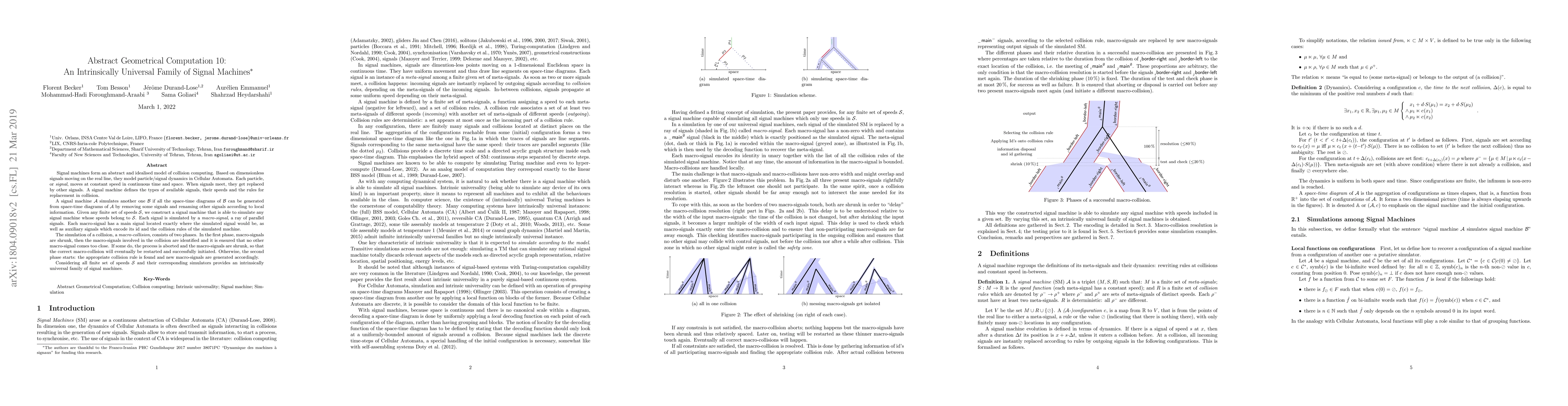Signal machines form an abstract and idealised model of collision computing. Based on dimensionless signals moving on the real line, they model particle/signal dynamics in Cellular Automata. Each particle, or signal, moves at constant speed in continuous time and space. When signals meet, they get replaced by other signals. A signal machine defines the types of available signals, their speeds and the rules for replacement in collision. A signal machine A simulates another one B if all the space-time diagrams of B can be generated from space-time diagrams of A by removing some signals and renaming other signals according to local information. Given any finite set of speeds S, we construct a signal machine that is able to simulate any signal machine whose speeds belong to S. Each signal is simulated by a macro-signal, a ray of parallel signals. Each macro-signal has a main signal located exactly where the simulated signal would be, as well as auxiliary signals which encode its id and the collision rules of the simulated machine. The simulation of a collision, a macro-collision, consists of two phases. In the first phase, macro-signals are shrunk, then the macro-signals involved in the collision are identified and it is ensured that no other macro-signal comes too close. If some do, the process is aborted and the macro-signals are shrunk, so that the correct macro-collision will eventually be restarted and successfully initiated. Otherwise, the second phase starts: the appropriate collision rule is found and new macro-signals are generated accordingly. Considering all finite set of speeds S and their corresponding simulators provides an intrinsically universal family of signal machines.